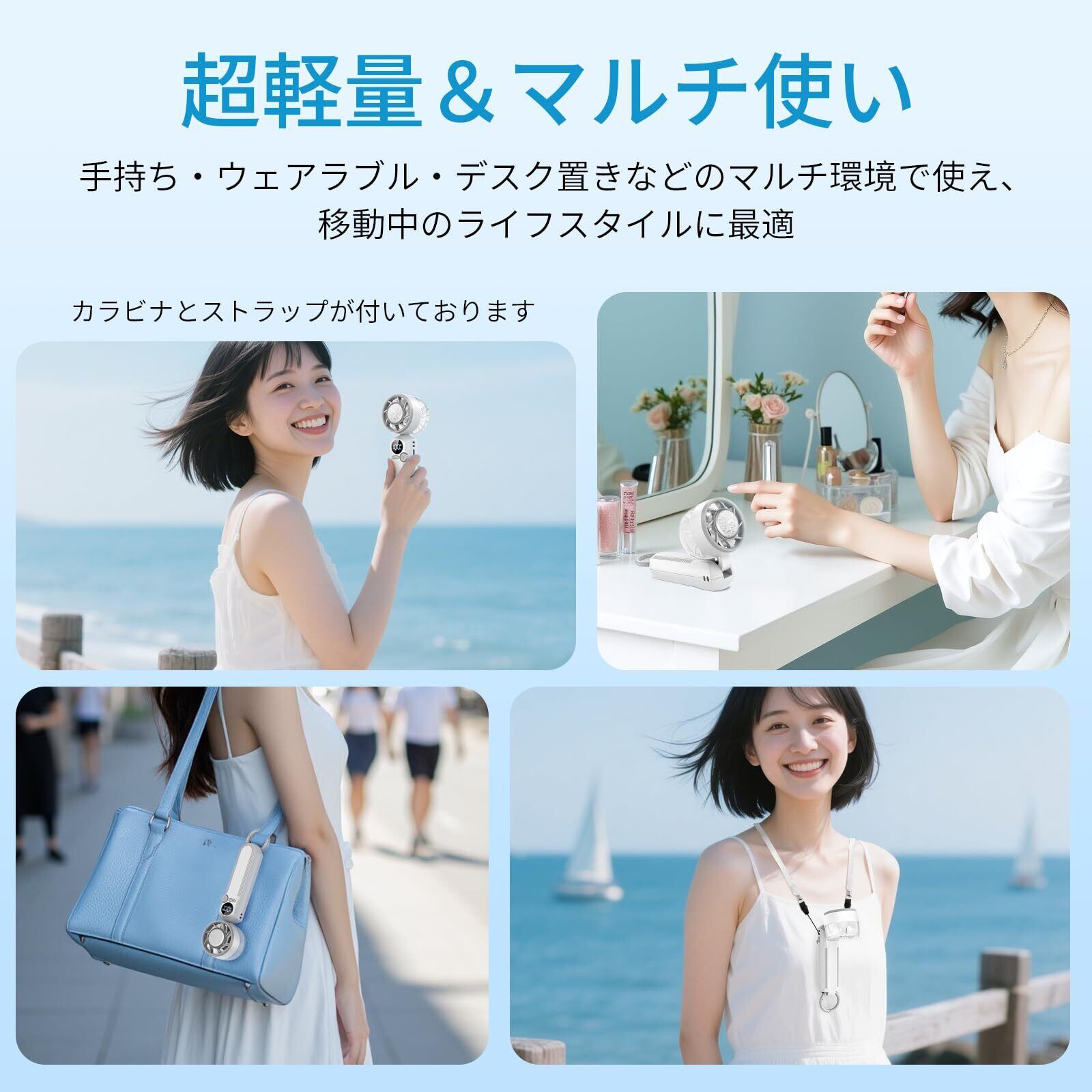 特徴 100段階のパワフル風量と六ヶ月間の保障期間, 2h急速充電で最長12h稼働可能, カラビナとストラップ付き, 超軽量160g, 首掛け/卓上/手持ち/腰掛け4way