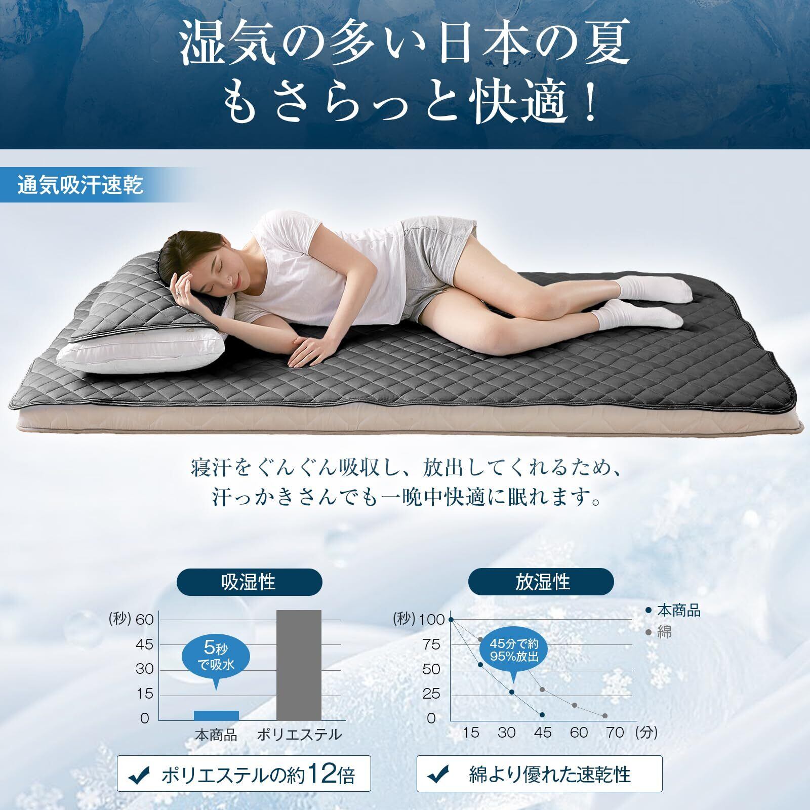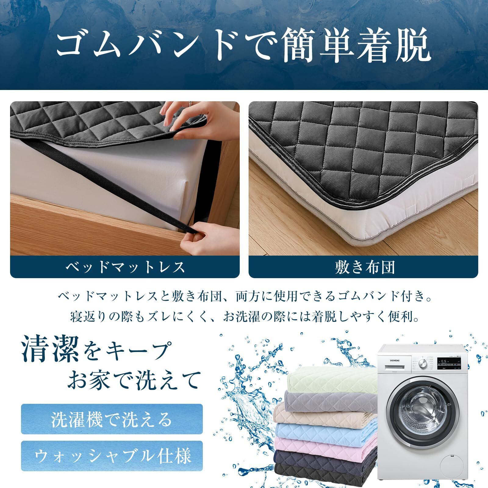 ❉【丸洗い可能・ゴム付きでズレにくい】汗をかいたり汚れや臭いが気になったりした場合でも、丸洗いできるの常に清潔に保てます。吸水速乾の中材+メッシュ構造なので、乾きやすくて、で朝ご洗濯して干せばその日の夜には使え。敷パッドの四隅にゴムバンドが付いているので、敷きパッド を布団にしっかり固定できます。シーツやカバーより、お洗濯の際の取り外し&取り付けも簡単なので、家事の負担も軽減してくれます。