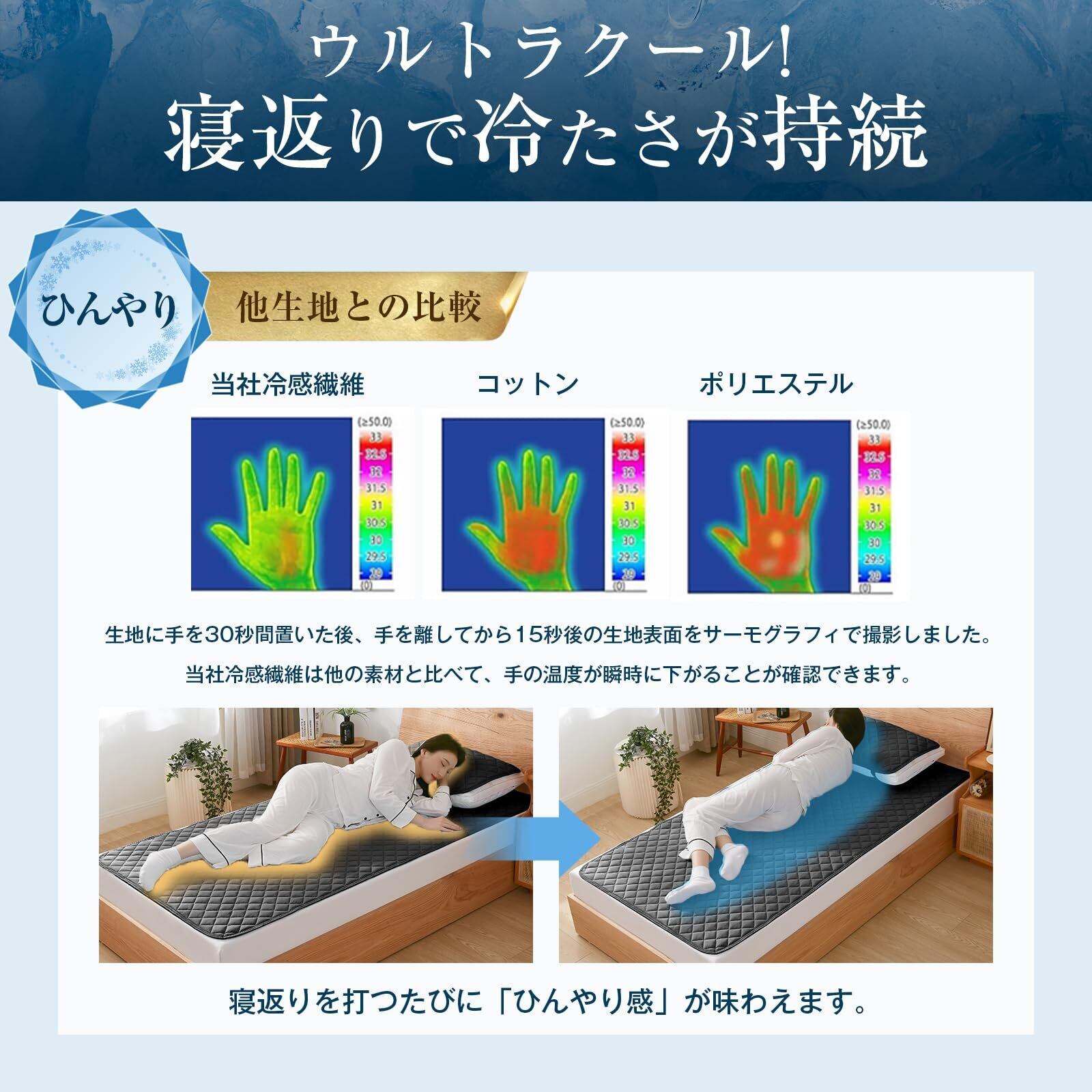 ❉【ひんやり・接触冷感】触った瞬間ひんやり!夏場の快眠には、このサラサラ&ひんやりの冷感敷きパッドで快適に過ごせる。寝返りなどの度に心地良いひんやり感が伝われる。冷房との併用でひんやり度がさらにUP!火照った体を冷たい敷きパッドでクールダウン!ひんやり冷たくて気持ちがよいので、寝苦しい夜も快適な眠りをお届けします!夏の快眠グッズとして、暑がりさんにはぜひおススメ。ギフト用にも大変喜ばれています!!