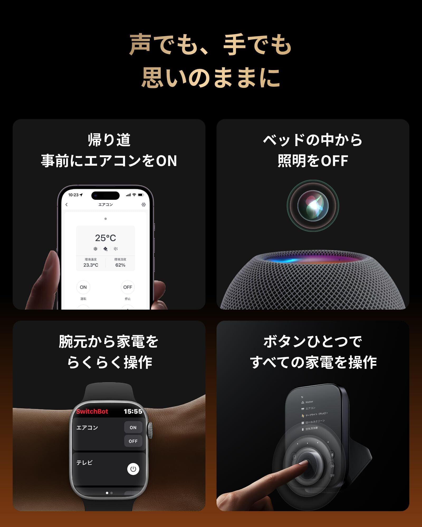 【赤外線家電も、Fire TVも、Matterデバイスも、すべてをこの一台で】エアコンや照明など、あらゆる赤外線家電をまとめて操作&管理。ワンタッチでペアリングできて初心者でも使いやすいです。また、Fire TV/Apple TV/Android TVのリモコンとしても活躍。ダイヤルを回してチャンネルを切り替えたり、音量を調節したりできます。カーテンの開け閉めやロボット掃除機の起動など、SwitchBotデバイスの操作にも対応。また、ネットワークが切断した時やサーバー障害時でもエアコン操作を可能にする「ローカルコントロール機能」あり。