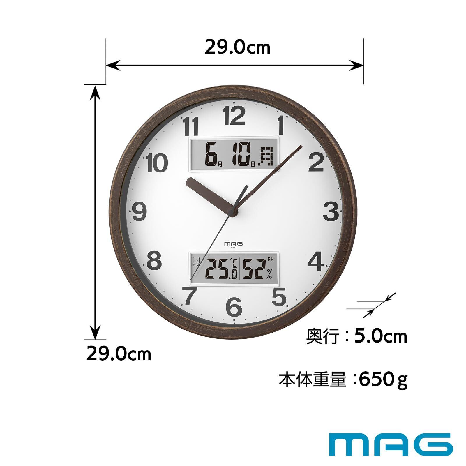 MAG(マグ) 掛け時計 壁掛け時計 アナログ おしゃれ インテリア 温度計 湿度計 温湿度計 カレンダー 静音 連続秒針 直径29.0㎝ 木目調 ブラウン ダブルポイント W-807A BR-Z ノア精密