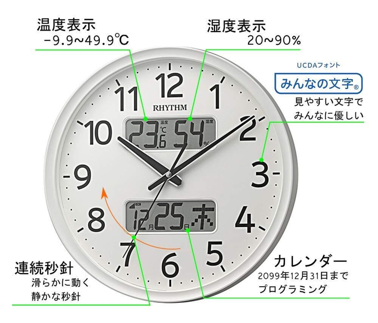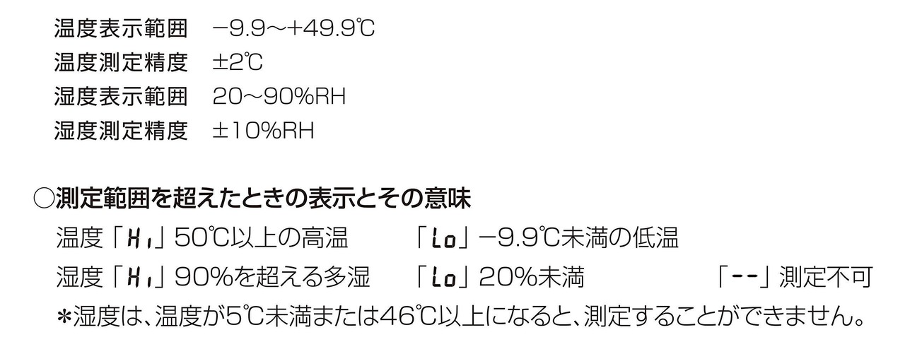 温度表示:-9.9~49.9℃、湿度表示:20~90%、カレンダー:2099年12月31日までプログラム