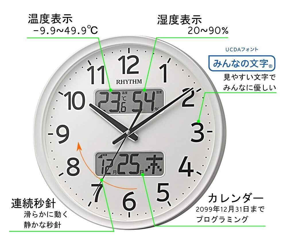 リズム(RHYTHM) 掛け時計 電波時計 アナログ 連続秒針 温度 湿度 カレンダー 白 Φ35x5.3cm 8FYA03SR03
