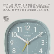 ユニバーサルデザインフォントを使用した見やすい大きめの文字板と、音が静かな秒針、お部屋を引き立てるグレイッシュカラーが毎日のくらしに寄り添います。