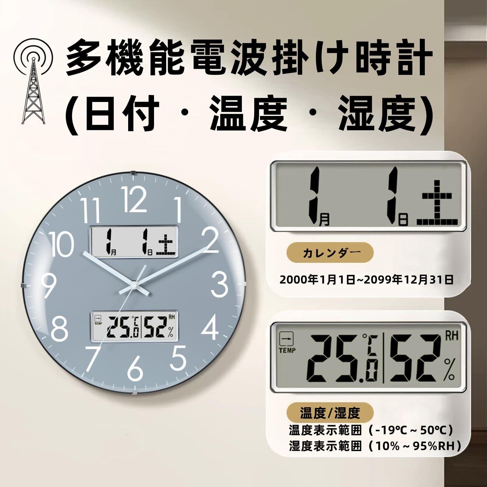 【2022最新】掛け時計 電波時計 温度・湿度・日付・曜日表示 33cm直径 アナログ 夜間秒針止まり(22時~6時) 静音 球面ガラス グレー