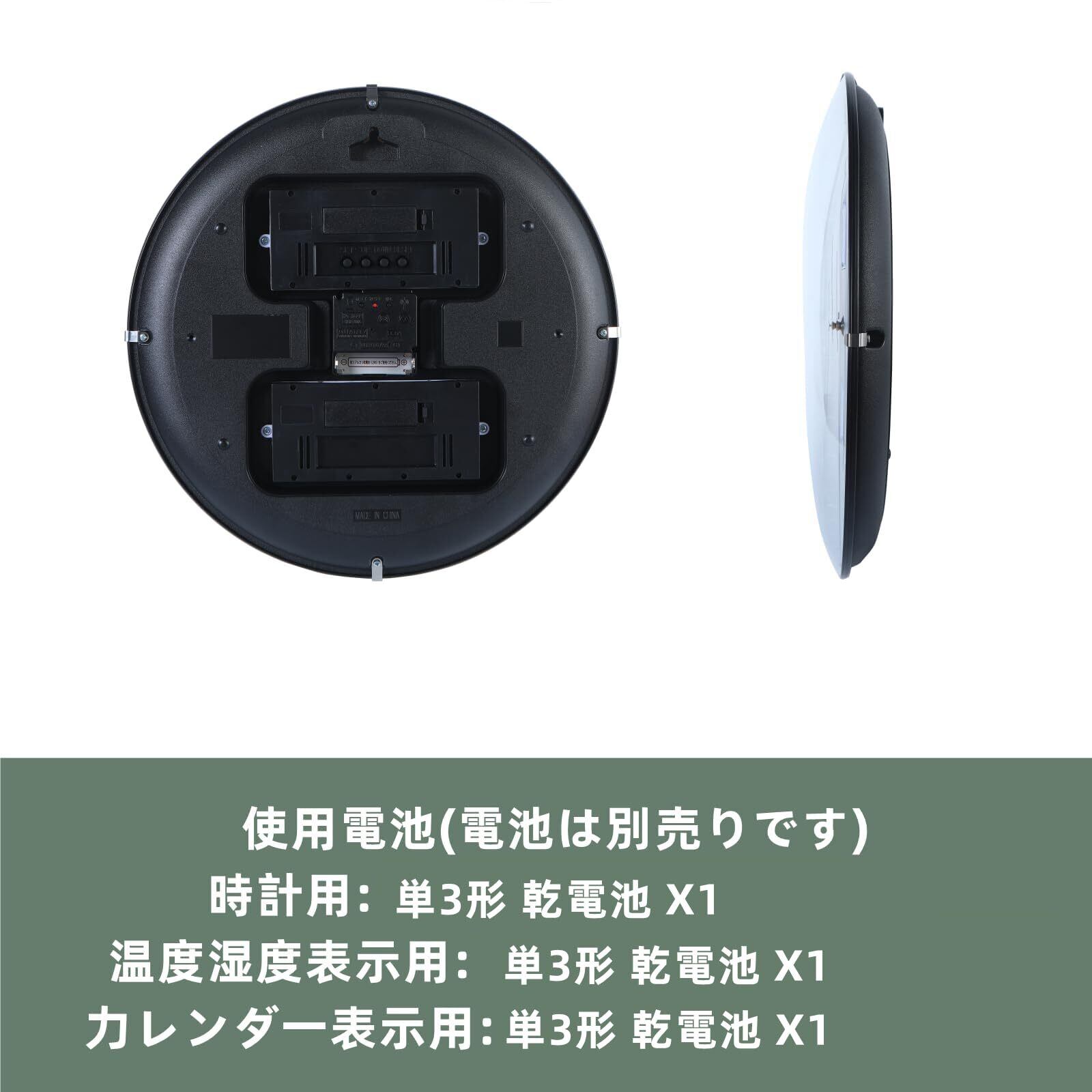 電池:単3形 乾電池 X 3本(別売)(時計、カレンダー表示、温度湿度表示にそれぞれ使用)
