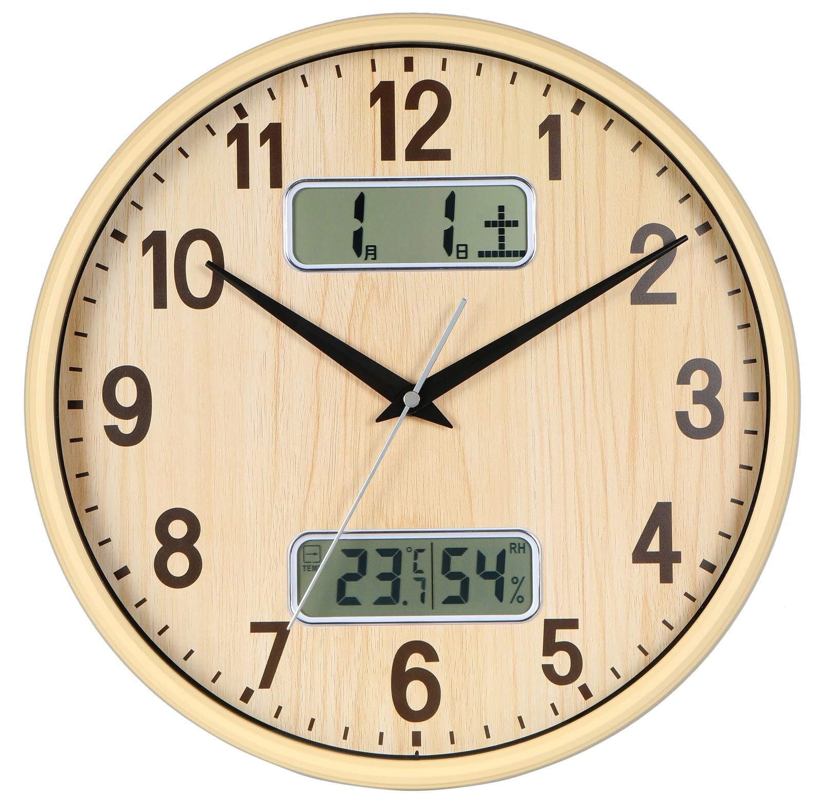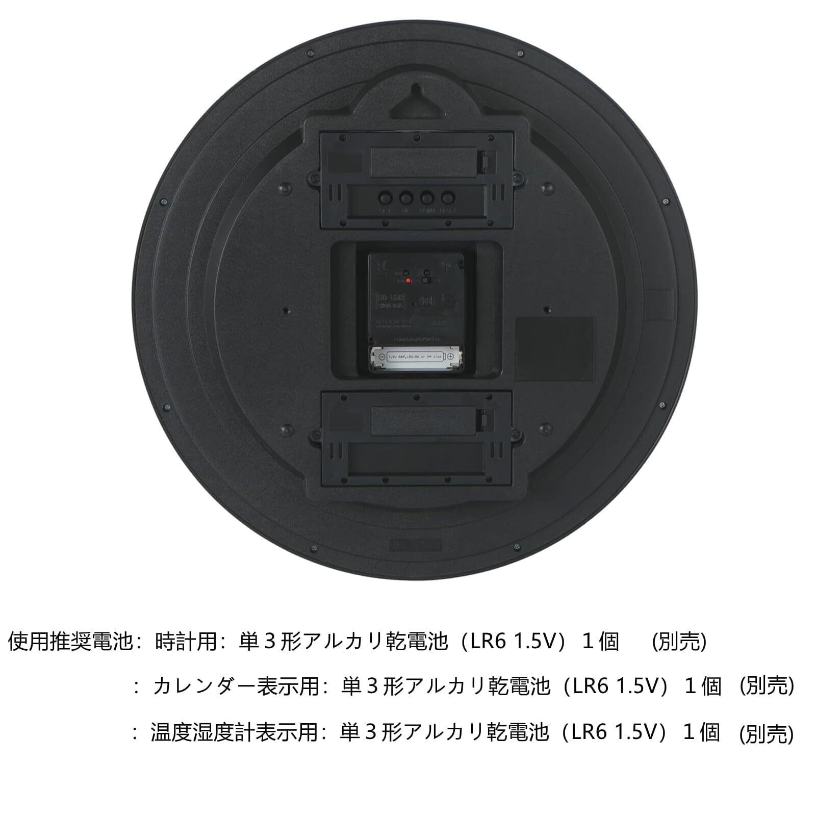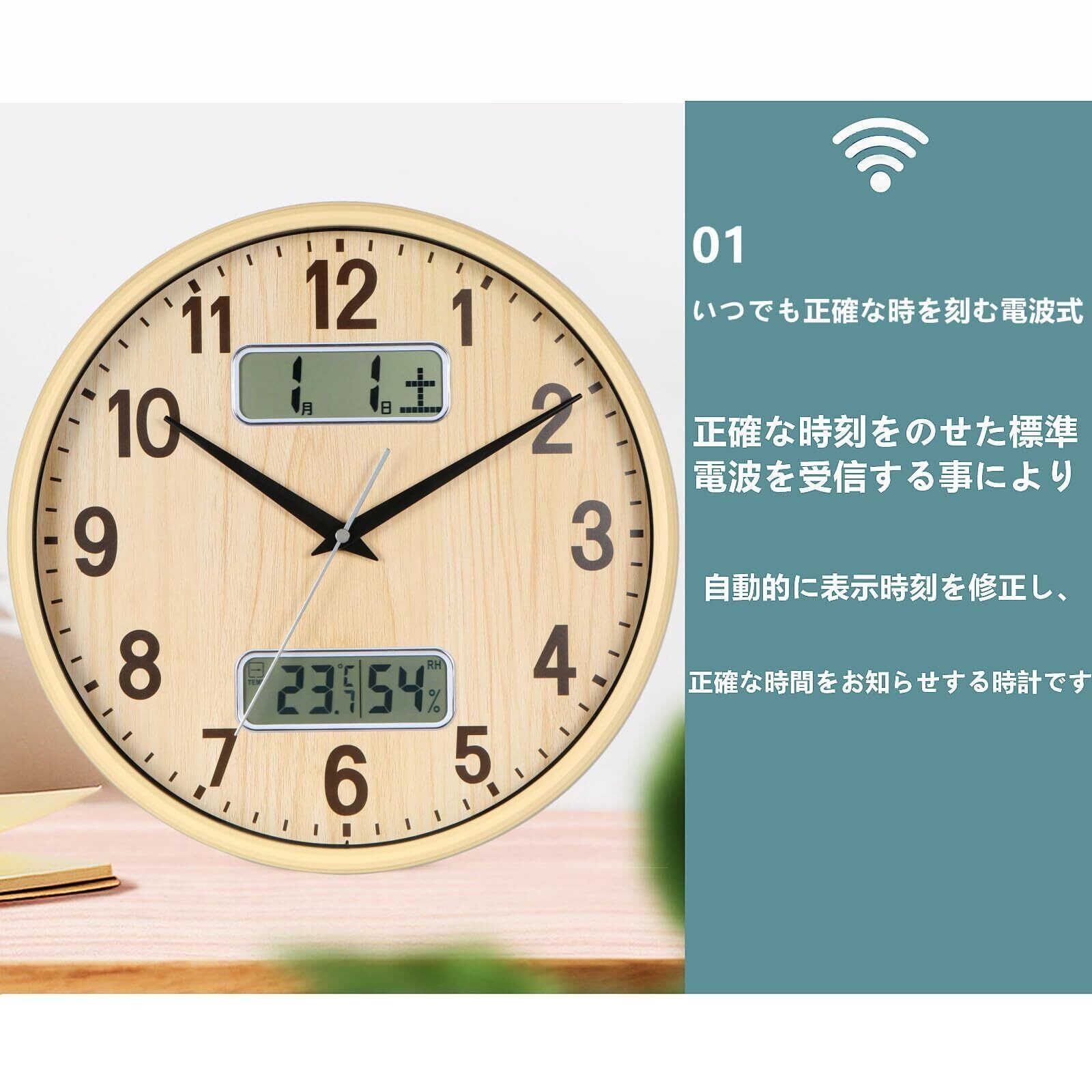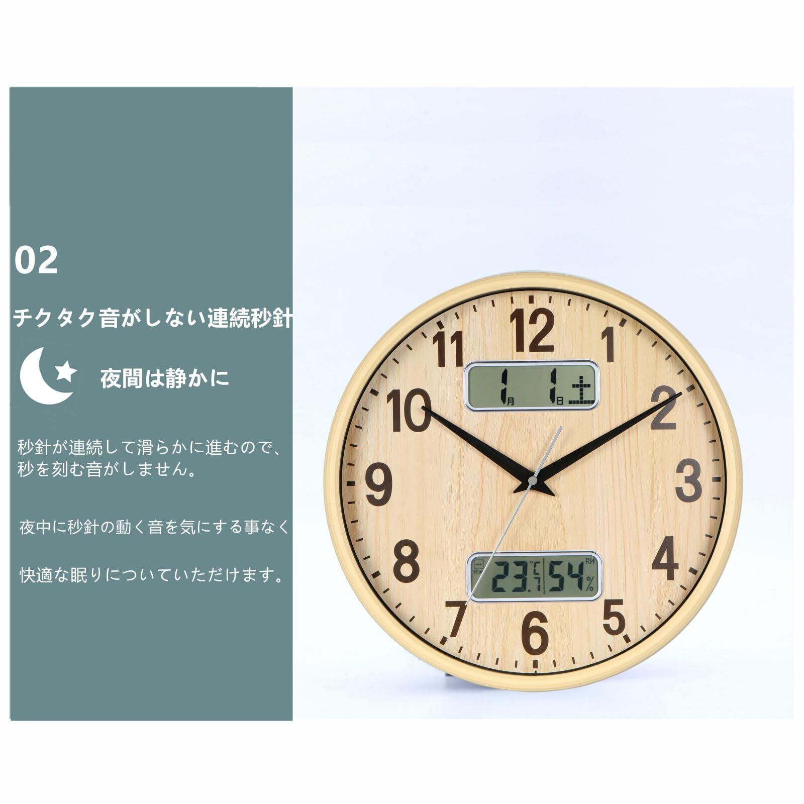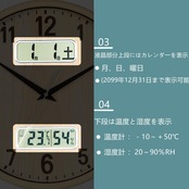 機能:時刻を自動で修正する電波時計、 秒針の音がコチコチならない静かな連続秒針を採用、カレンダー表示、温度 湿度表示