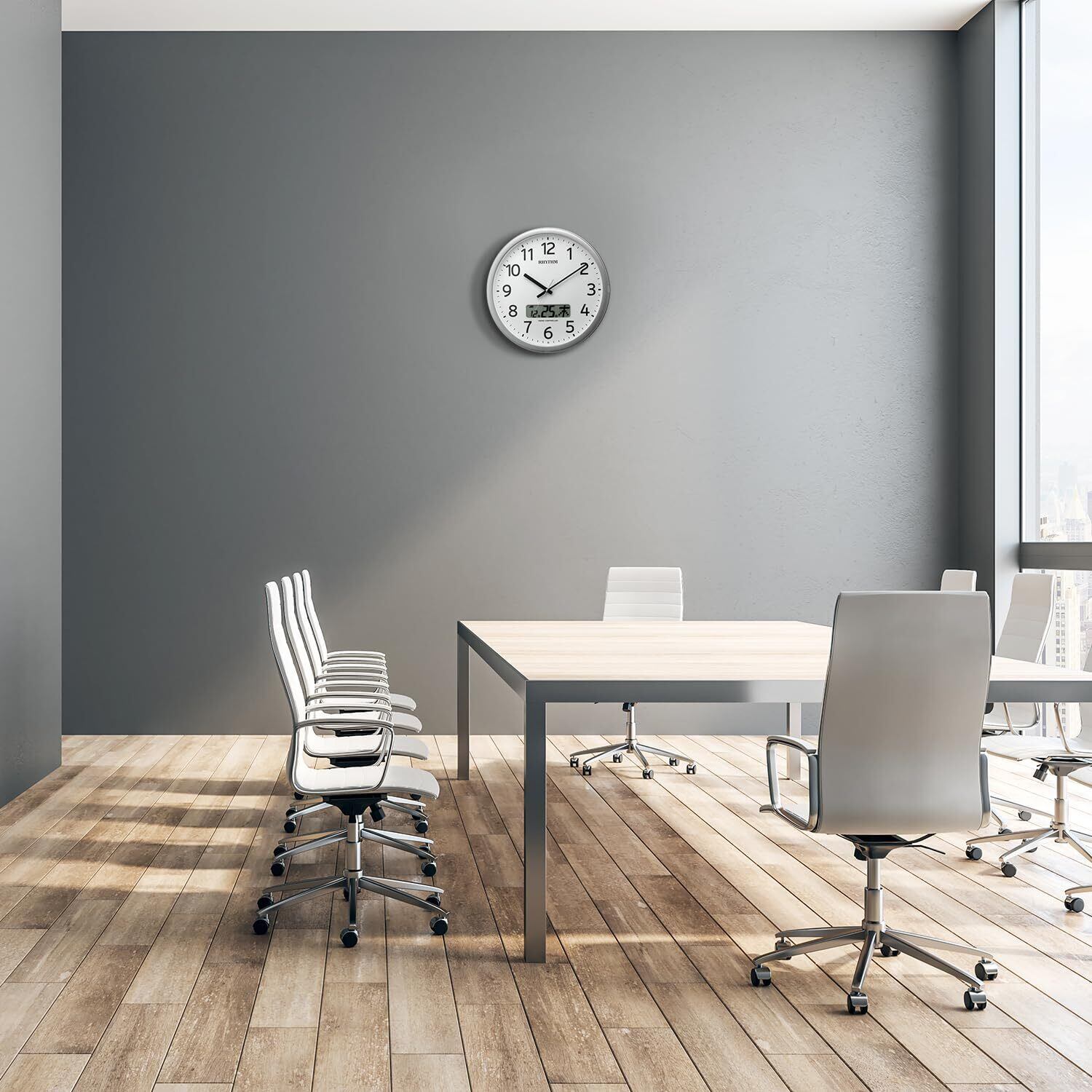 【数量限定】リズム(RHYTHM) 掛け時計 電波時計 オフィス 24回チャイム機能 時報機能 カレンダー シルバー Φ35×5.5cm オフィス用品 工場 事務所 プログラムカレンダー 01SR 4FNA01SR19