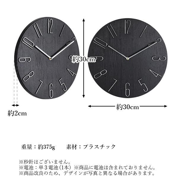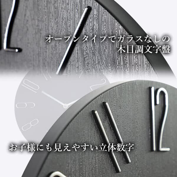 ・北米風の壁掛け時計です。 ・オープンタイプでガラスなしの木目調文字盤になっています。 ・カチカチと音が出ない静音設計になっています。 ・数字が立体数字になっているのでお子様にも見やすくなっています。 【商品仕様】 カラー ブラック 素材 プラスチック