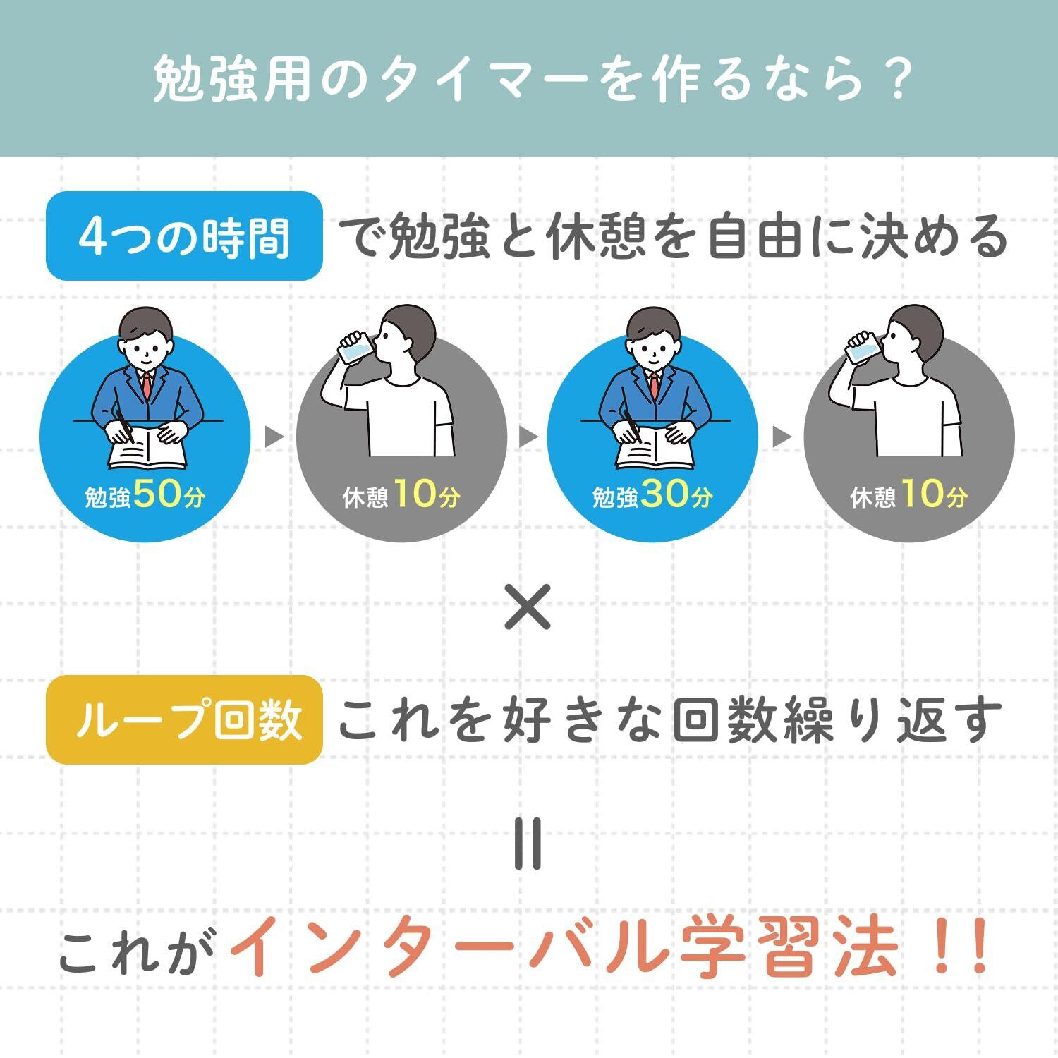 【高度なインターバルタイマー】習慣づけ、ランダム学習、インターバル式学習に役立つ「私のルーティーン」。従来の大人気インターバル学習タイマーから進化して3つのインターバルタイム設定で、1つのプログラムに4つまでタイムセットができるようになりました。ループはカウントダウンとカウントのどちらかを選んでお使いいただけます。画面はプログラム番号の他、セットしたどのタイム計測中か、残りループ数またはループ回数表示が出るからわかりやすい!高度なプログラムで朝のルーティーン、勉強用、趣味用と自分専用に細かく作って使い分けできる! ※ループのカウントダウンをループカウントにする際は設定しなおしが必要です。ループカウントをループのカウントダウンにする場合も同じく。