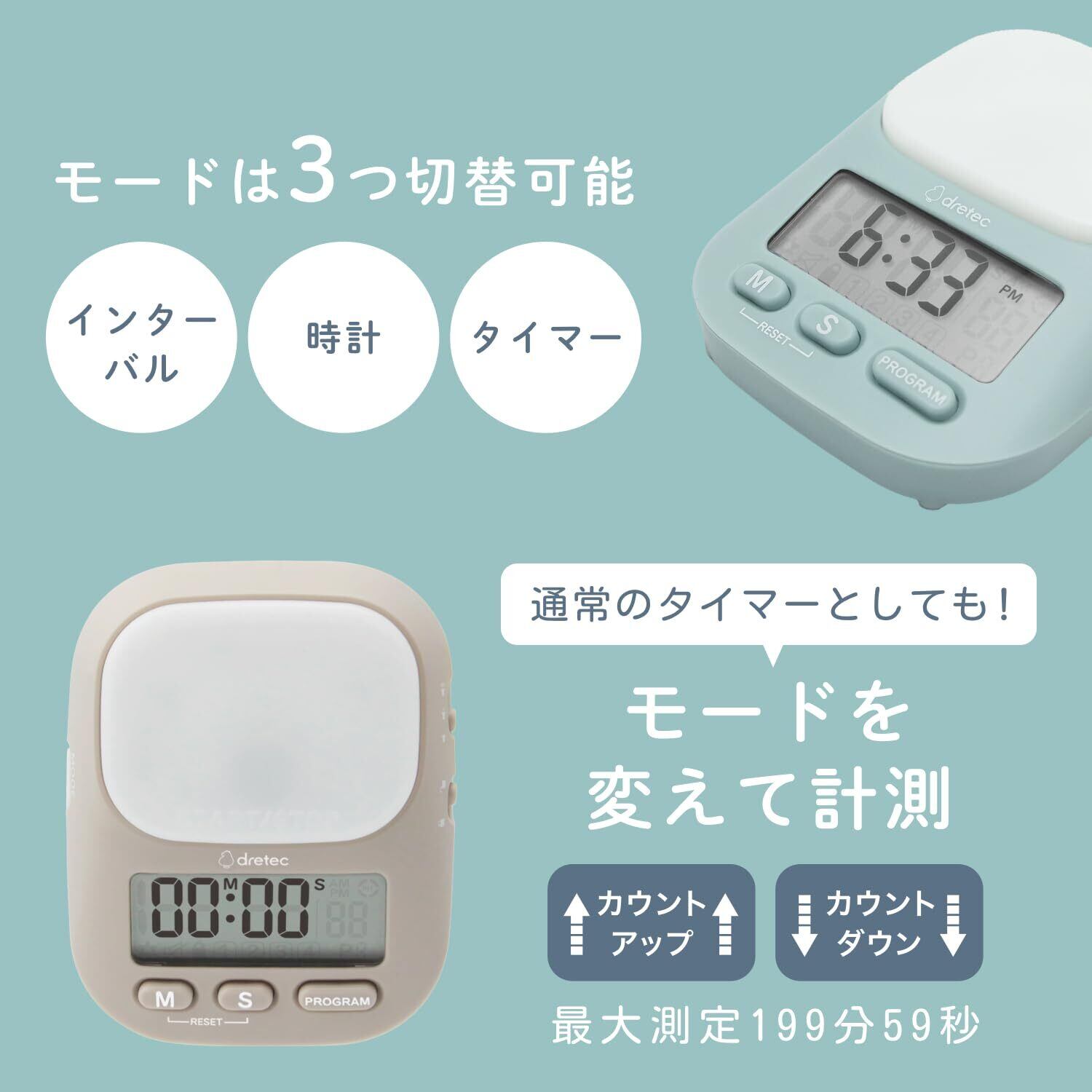 【時計機能】側面のモード切り替えボタンで簡単に時刻確認。タイマー設定中も時間の確認ができます。表示は選べる12時間表示、24時間表示。12時間表示は画面にAMまたはPM表示がされます。※AM/PM表示は自動的に変わります。