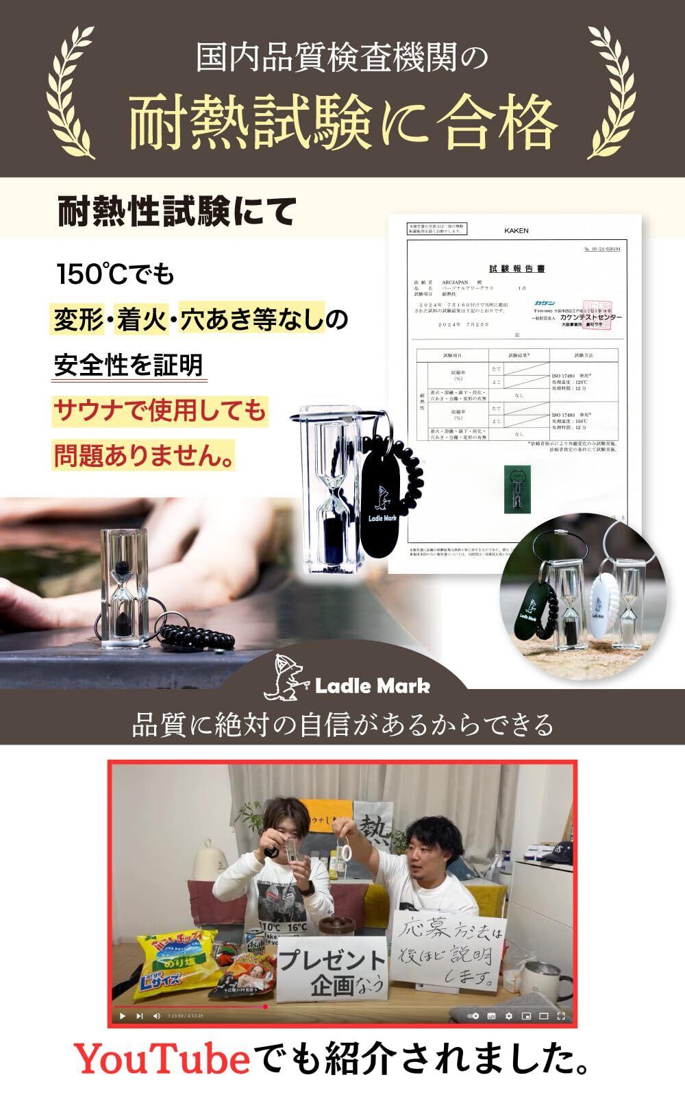 【耐熱性に優れた素材】「150度以上にも耐える、安心の耐熱設計!」 この砂時計は、サウナの高温環境にも耐えうる優れた耐熱性能を持っています。ホウケイ酸ガラスのボディは割れにくく、サウナ内でも安心して使用可能。また、シンプルでおしゃれなクリアデザインが、サウナ室やお風呂場の雰囲気にもマッチ。しっかりと耐久性があり、何度でもくり返し使える信頼の品質です。