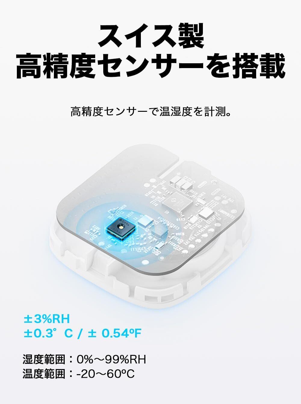 [スイス製センサー搭載] スイス製の高精度なセンサー。+-0.3°C/ +-3%RHに対応。