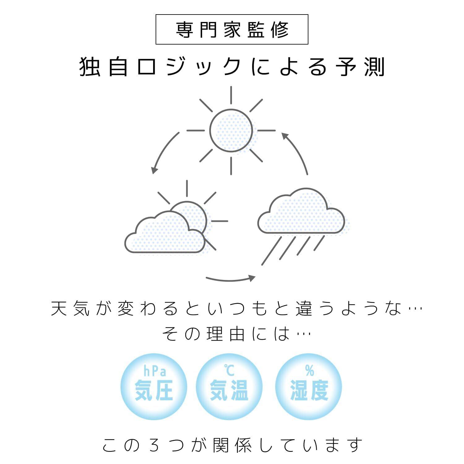 気圧の変化をリアルタイムで測定し、気圧の急上昇や低下に敏感な体調を、事前に整えるための手助けをしてくれます。専門家のせたがやクリニック院長・久手堅 司(くでけん つかさ)先生、および日本気象協会のもと、一定時間の気温差・気圧差・湿度をもとに独自のロジックで予測を行い、体調変化への対策を促すお知らせ機能を搭載しています。
