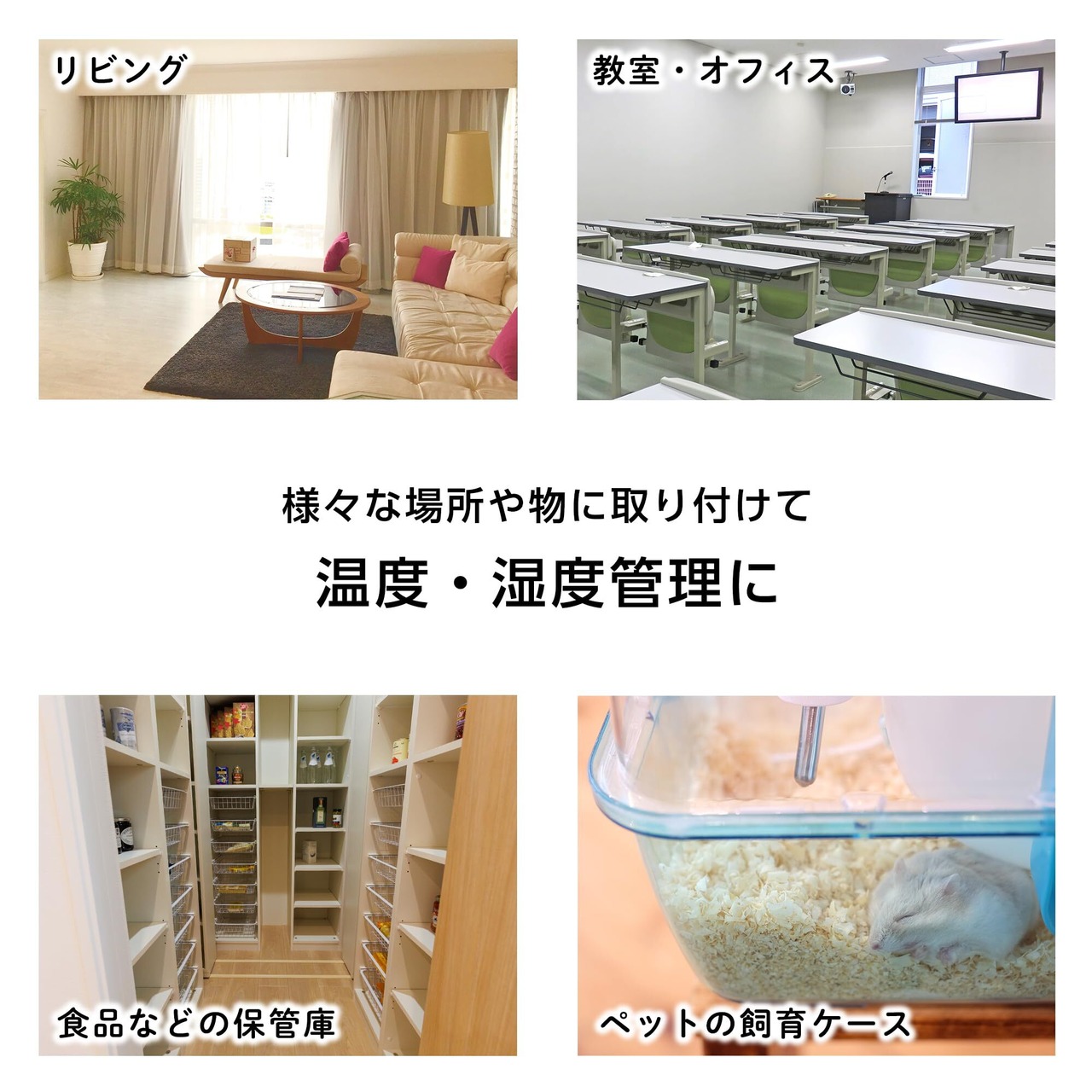 裏面に両面テープがついているので様々なところに張り付けて温度、湿度管理できます。