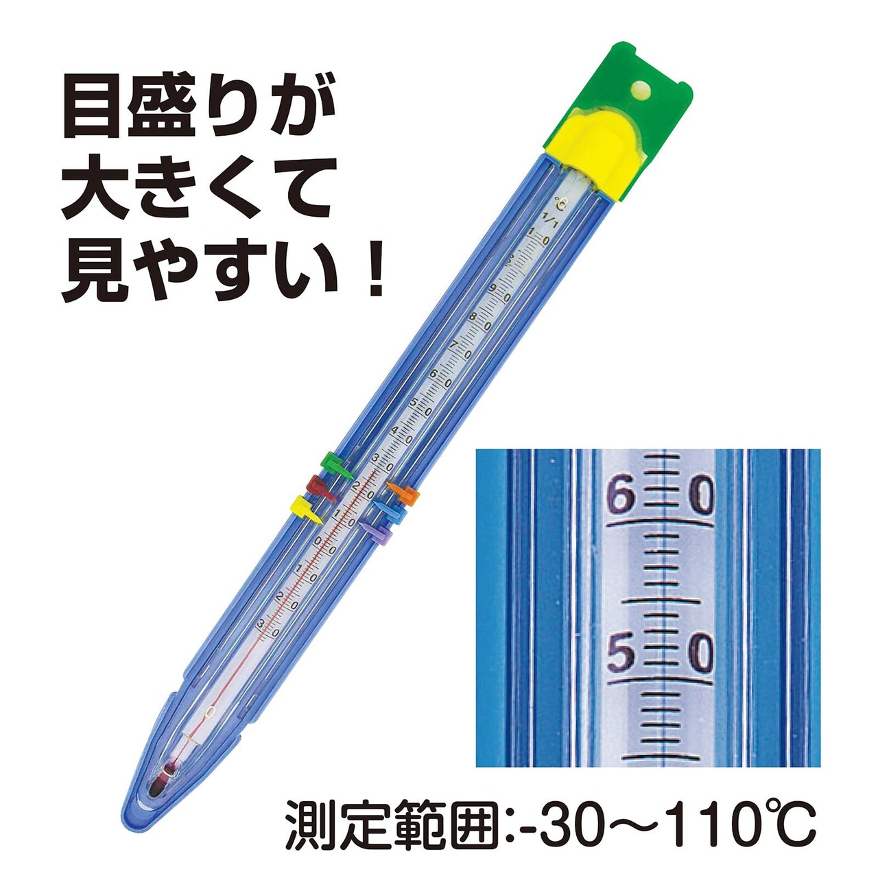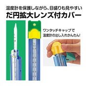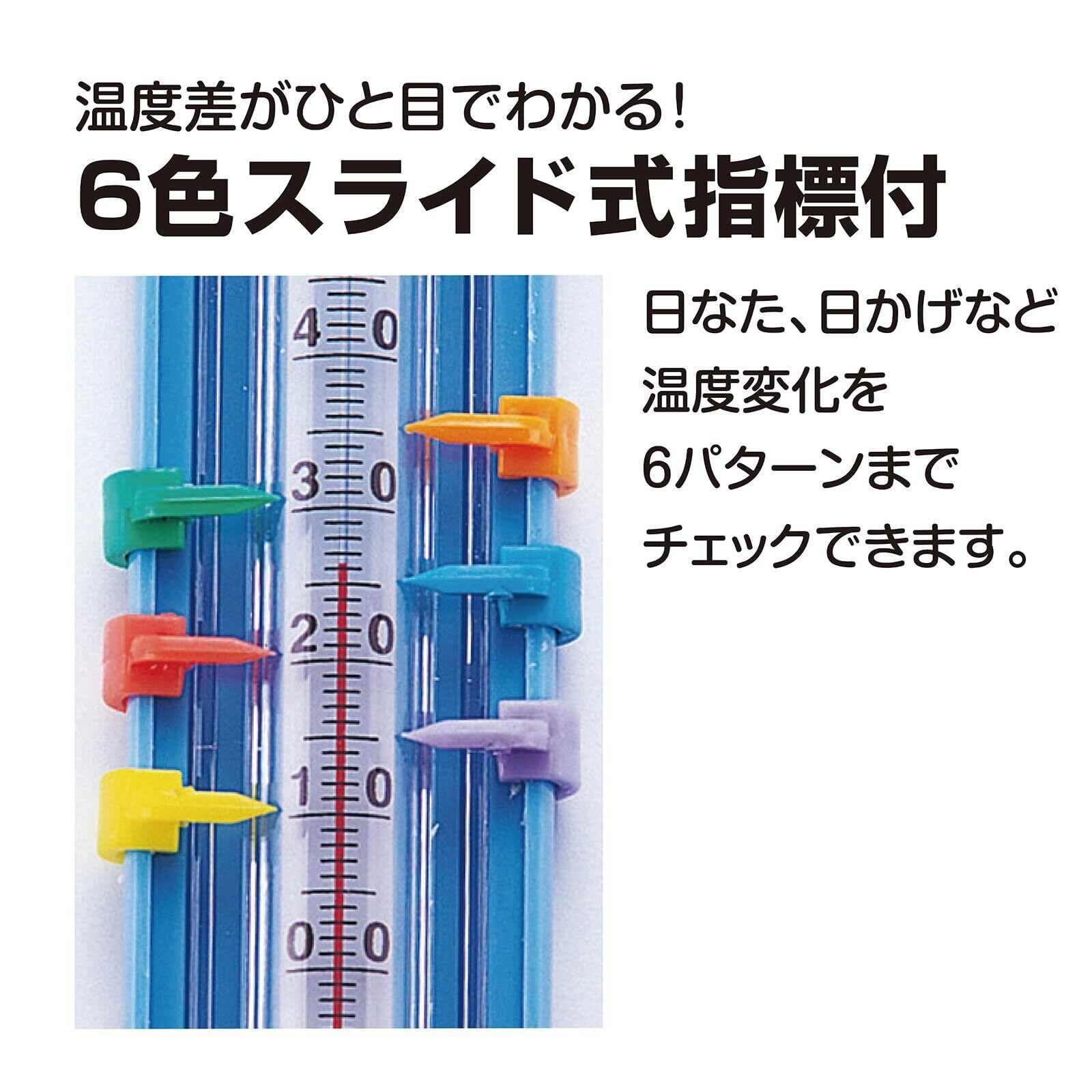 目盛りが大きくて見やすい温度計日なた、日かげなど温度変化を6パターンまで表せます。温度差がひと目でわかる!6色スライド式指標寒冷地でも問題なくお使いいただけます。土にさしても温度計がわれないカバー付
