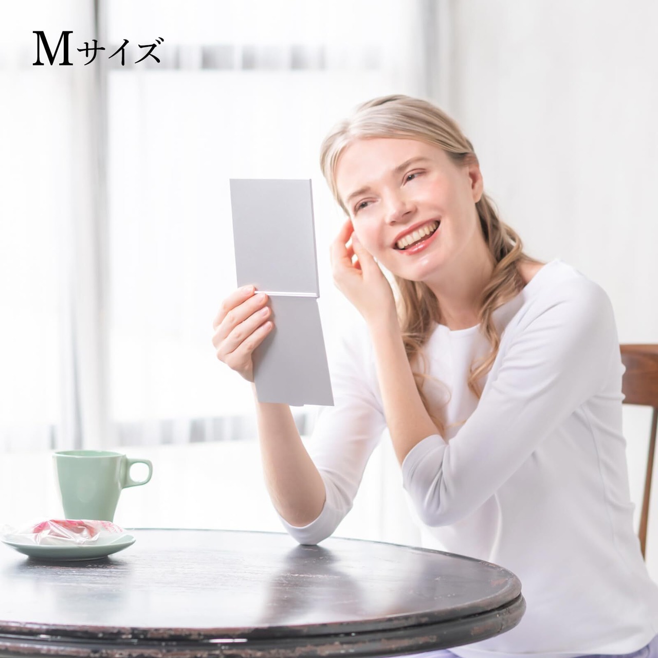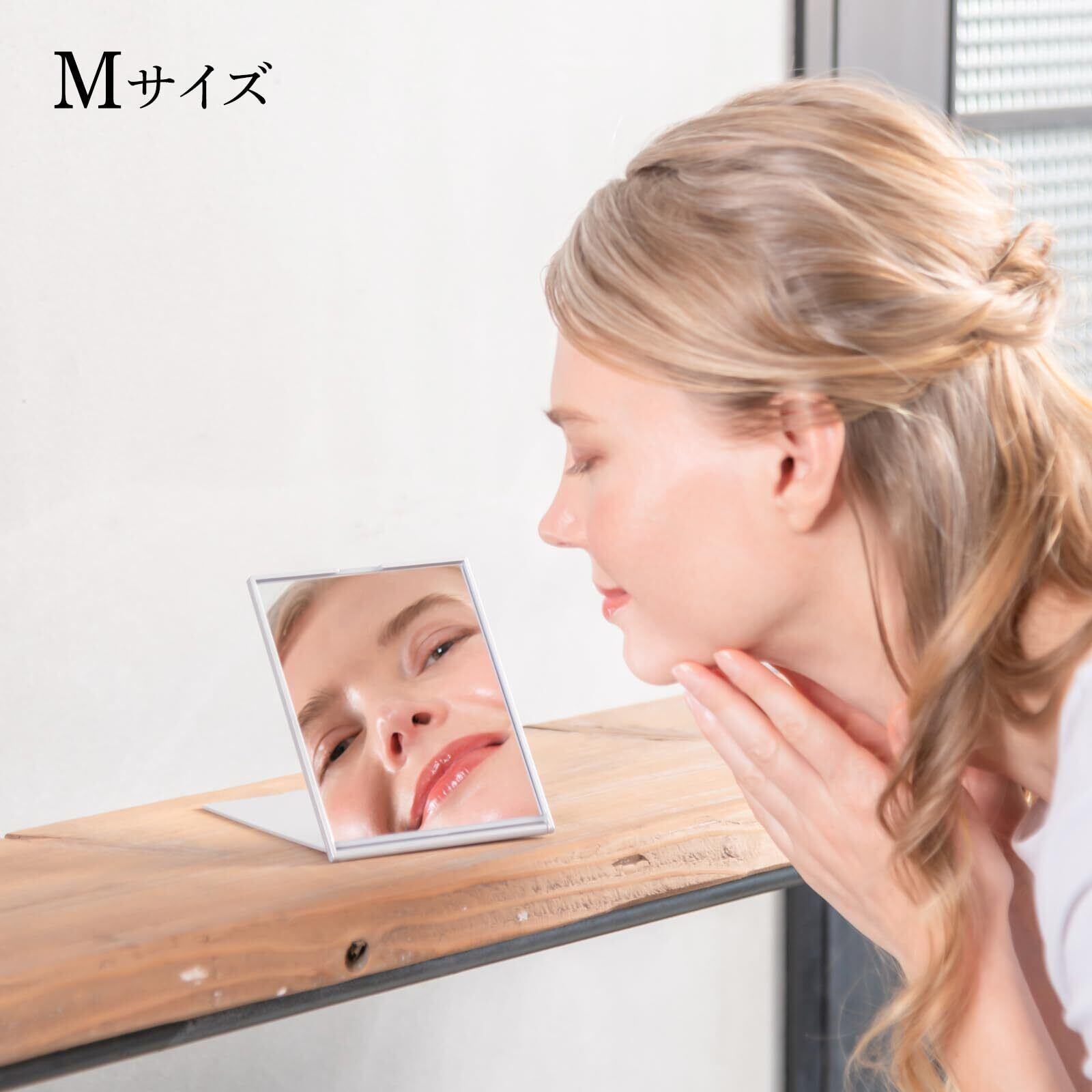 【二つ折りミラー】蓋が付いた二つ折りですので使い終われば蓋をして鏡面をカバーできます。また、蓋を裏返せばテーブルに置いてメイクが出来ます。