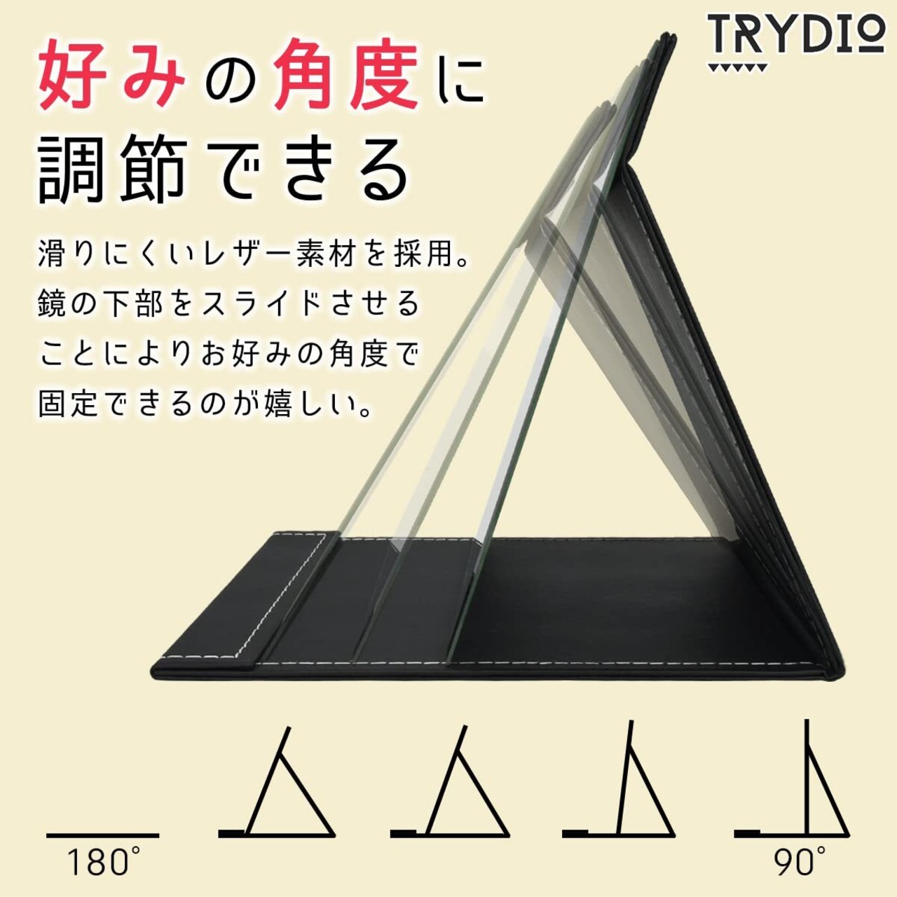 ミラーの下部をスライドさせることで角度を自由に調整できます。メイク箇所、方法に応じて最適な角度に固定できるのが魅力です。Lサイズは25cm×18cmの大型サイズ、フレームがなく鏡面部分を最大限活用できる仕様になっているので頭から胸元まで映すことが可能、メイクだけでなくヘアアレンジにも活用できます。
