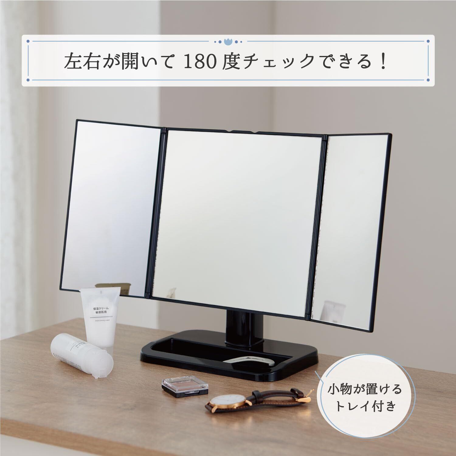 ・いろいろな角度からでも見やすい便利な三面鏡。左右のミラーを180度開けばワイドなミラーとしてご使用いただけます。