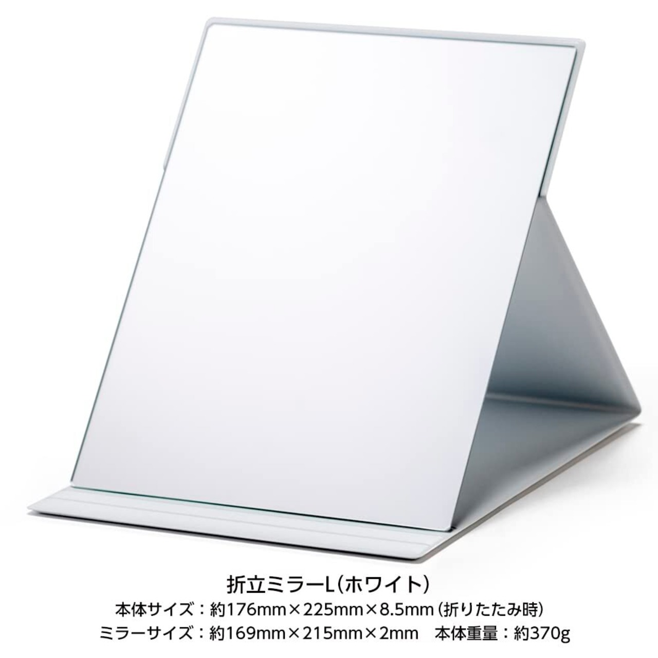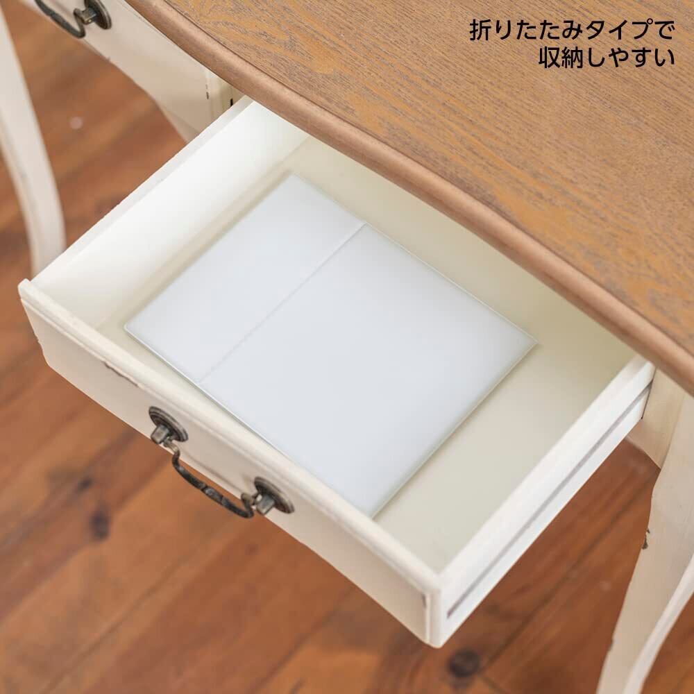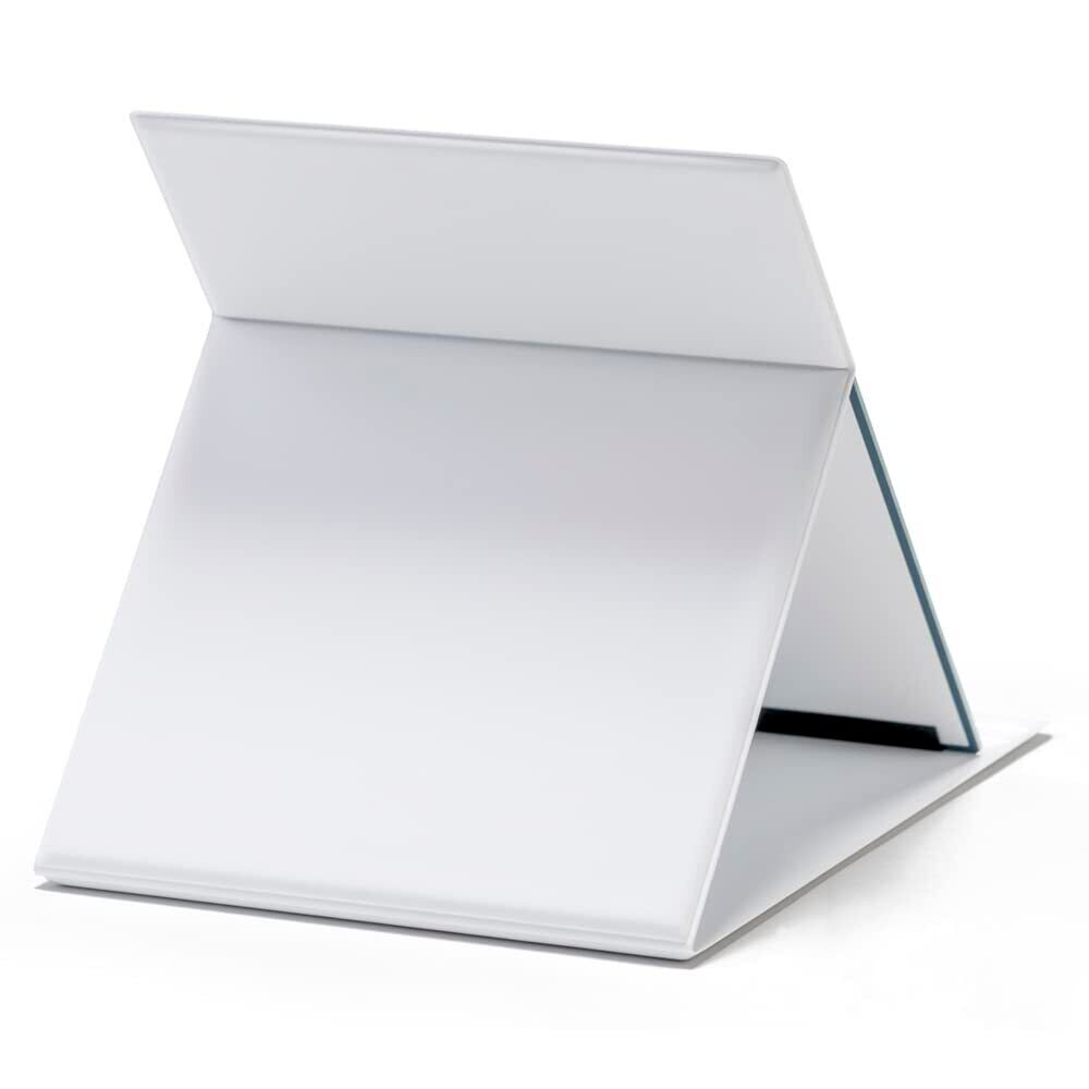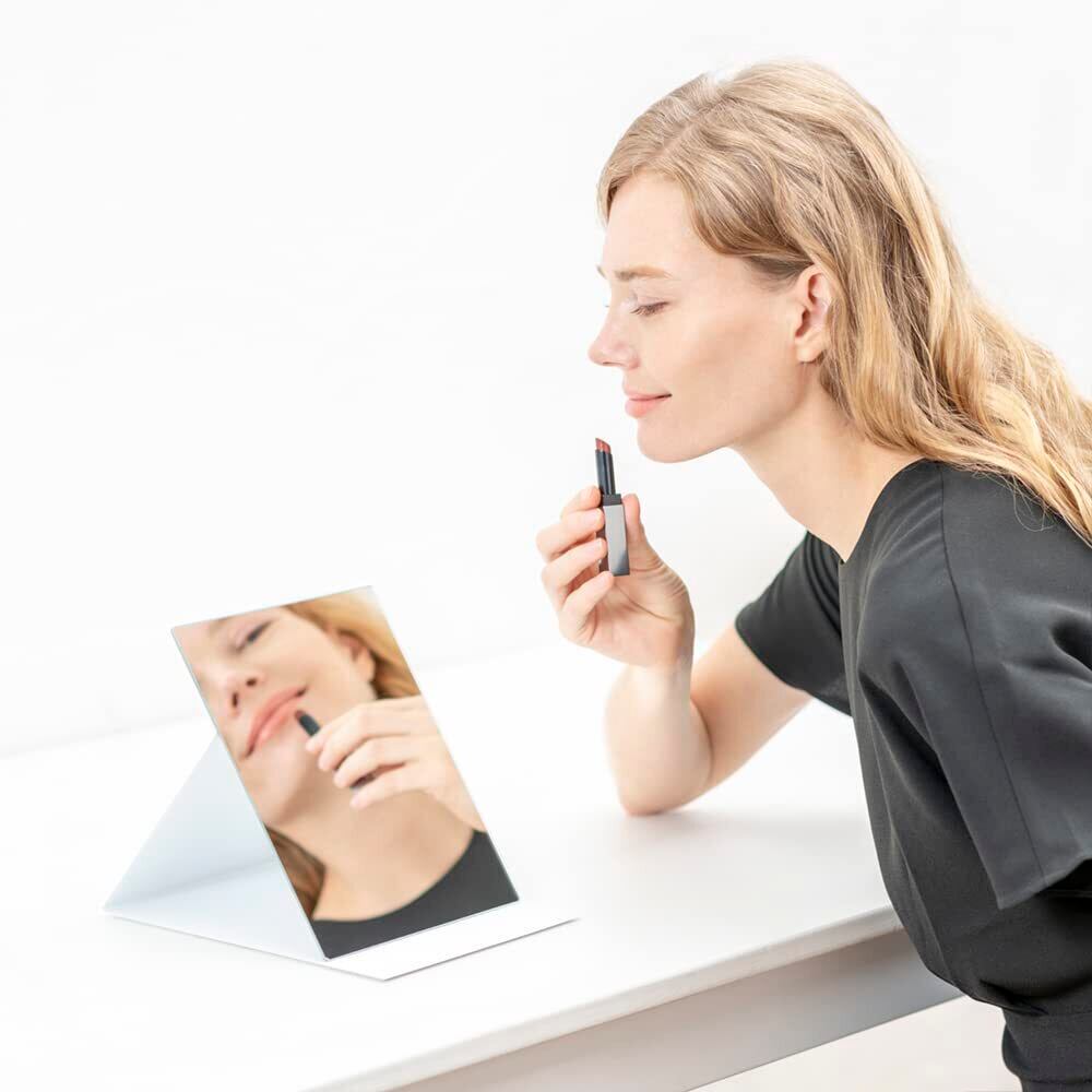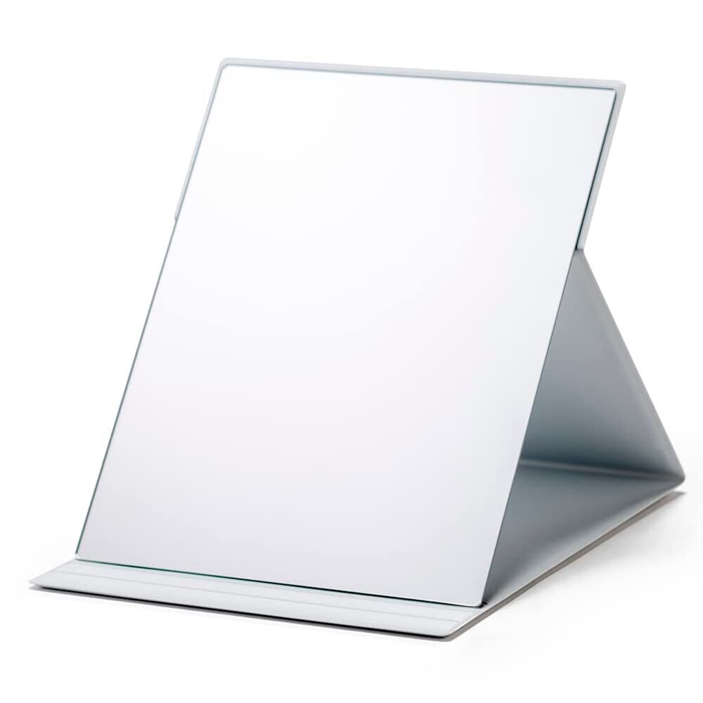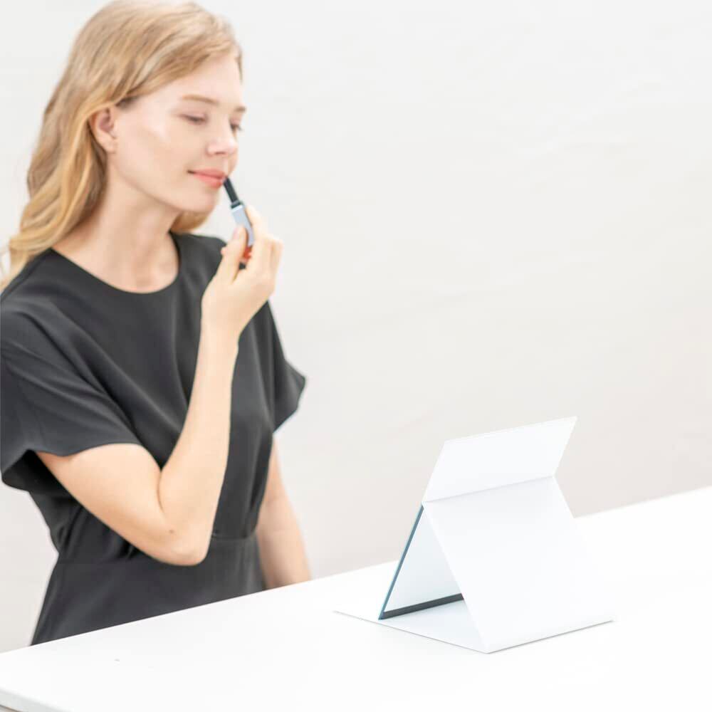 【軽量・コンパクト】従来の折りたたみミラー(当社比)よりも薄く軽いので、場所をとらずコンパクトに収納でき、引き出しやバッグに入れても邪魔になりません。旅行やお出かけ時など持ち運びに便利です。B5サイズのノートとほぼ同じサイズ。お顔全体が映りますので、ご自宅でのメイクに最適なサイズです。サイズ17.6cm×22.5cm、厚み0.85cm、重量約370g