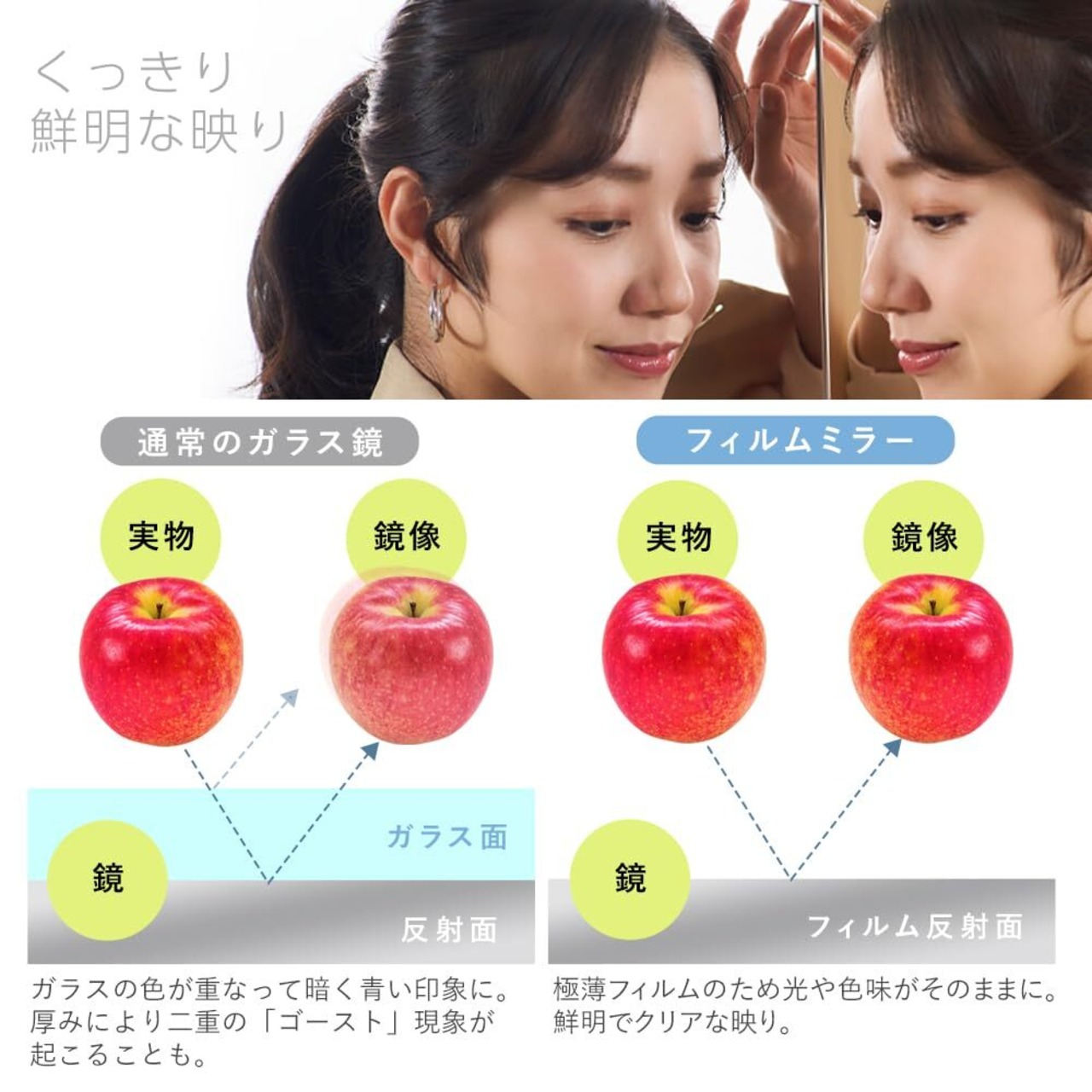 割れないからと言って、映りの質を犠牲にすることはありません。特殊加工されたフィルム素材により、歪みが少なくクリアな映りを実現。毎日のメイクやヘアセット、コーディネートチェックがより快適になります。