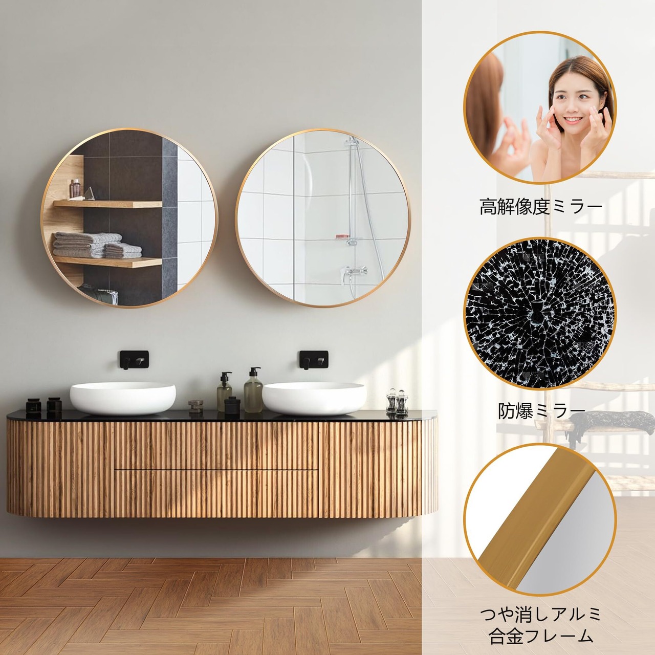 【心を込めるデザイン】高精細フロートガラスで仕上げたため、鏡面の透明度が高くて、派手なお姿や綺麗な室内レイアウトがはっきり映れます。丸い鏡の裏は鉛と銅を含まないアルミフレーム素材を使用し、バスルームのような湿度の高い環境でも使用できます。