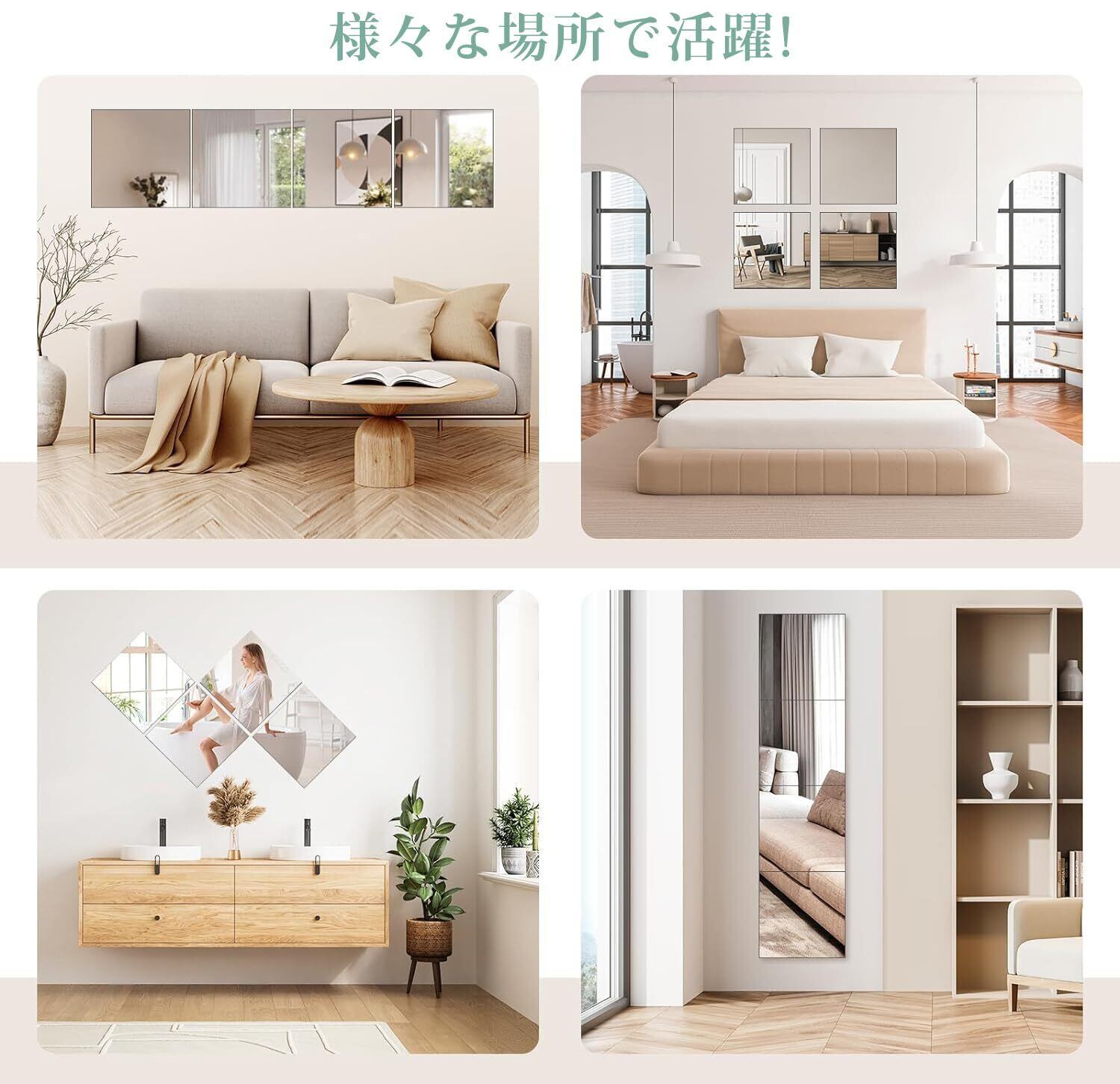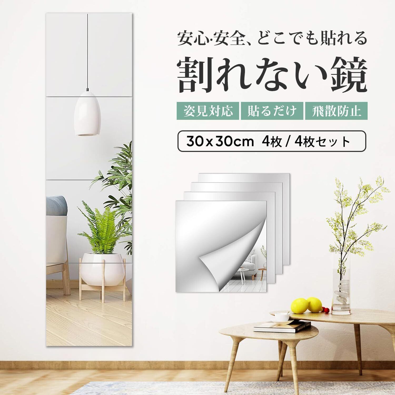 全身鏡 姿見鏡 どこでも貼れる割れない鏡 壁掛け ミラー 貼る鏡 アクリルミラー 飛散防止 穴あけ不要 便利 軽量 浴室 玄関 壁 リビング クローゼット (30×30cm 4枚セット)