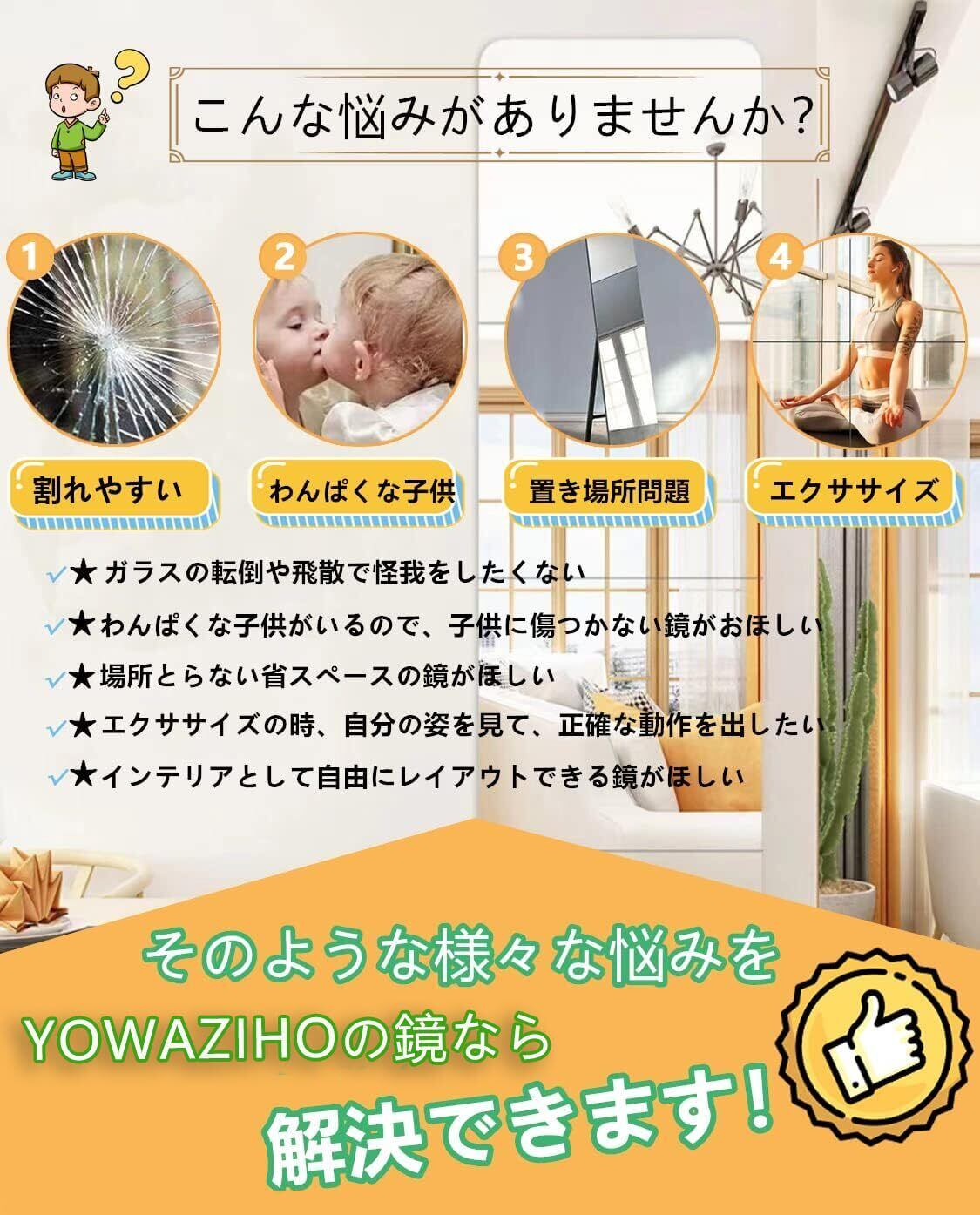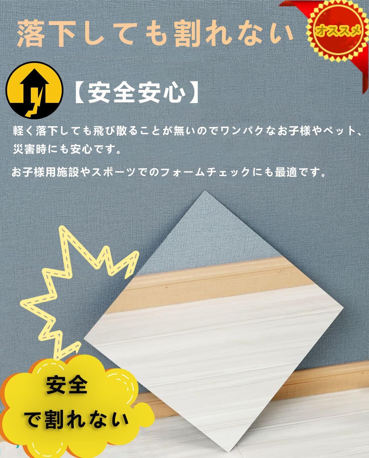【割れない、軽量設計】アクリル製で割れない、飛散防止ミラーです。軽量設計でガラス製鏡の三分の一の重量だけで、女性でも手軽く取り付けます。割れる心配が無いので、万が一落下しても鏡に比べ怪我のリスクが低下します。ワンパクなお子様やペット、地震など災害時にも安心です。お子様用施設やスポーツでのフォームチェックにも最適です。