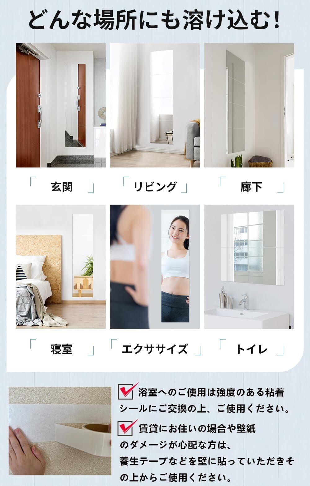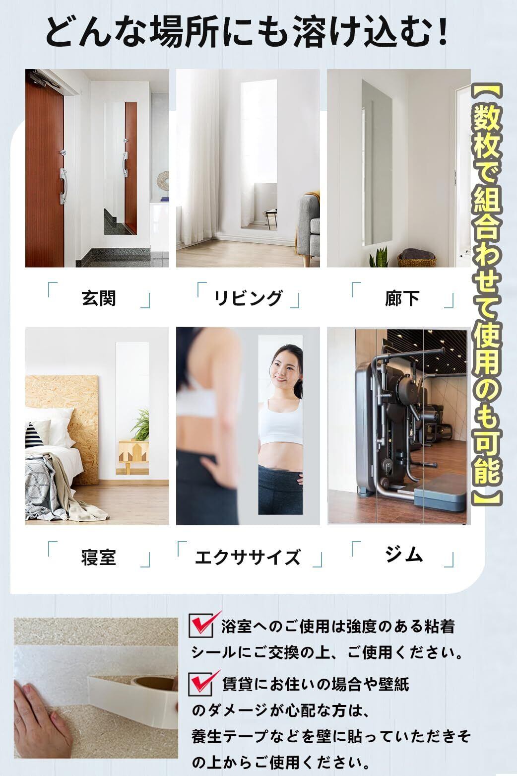【場所がとらない】壁さえあればどこでも設置可能。クローゼットやドアのウラ、玄関、浴室などところにスペースとらなく貼れます、いつでもスムーズに身だしなみがチェックできます。