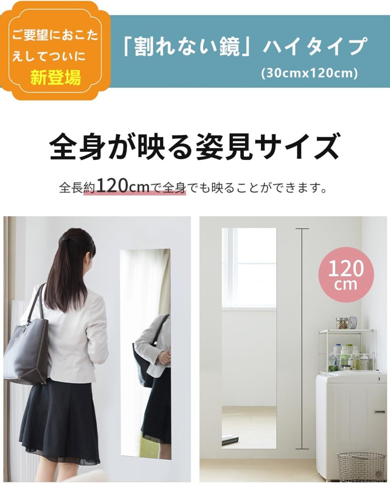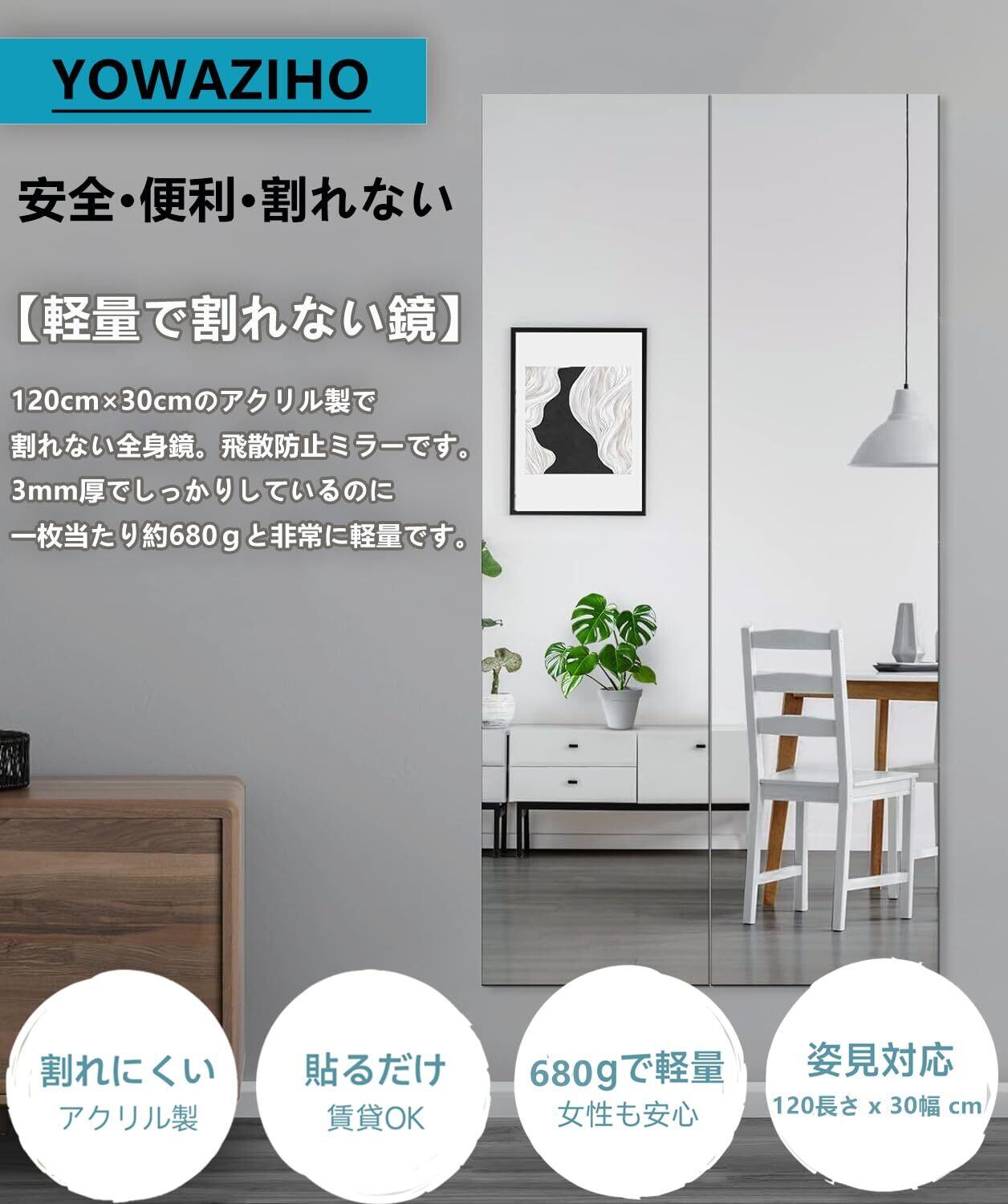 【製品仕様】120cm×30cm×2mm *1枚入、粘着シール付属。お客様のご要望にこたえして、一枚だけで姿見に使える大きいサイズがついに新登場!