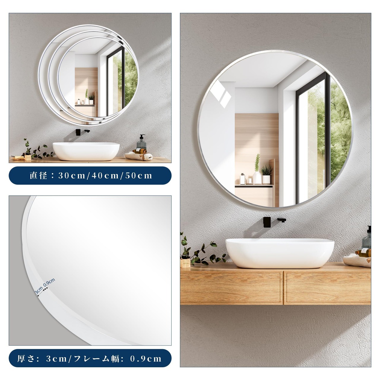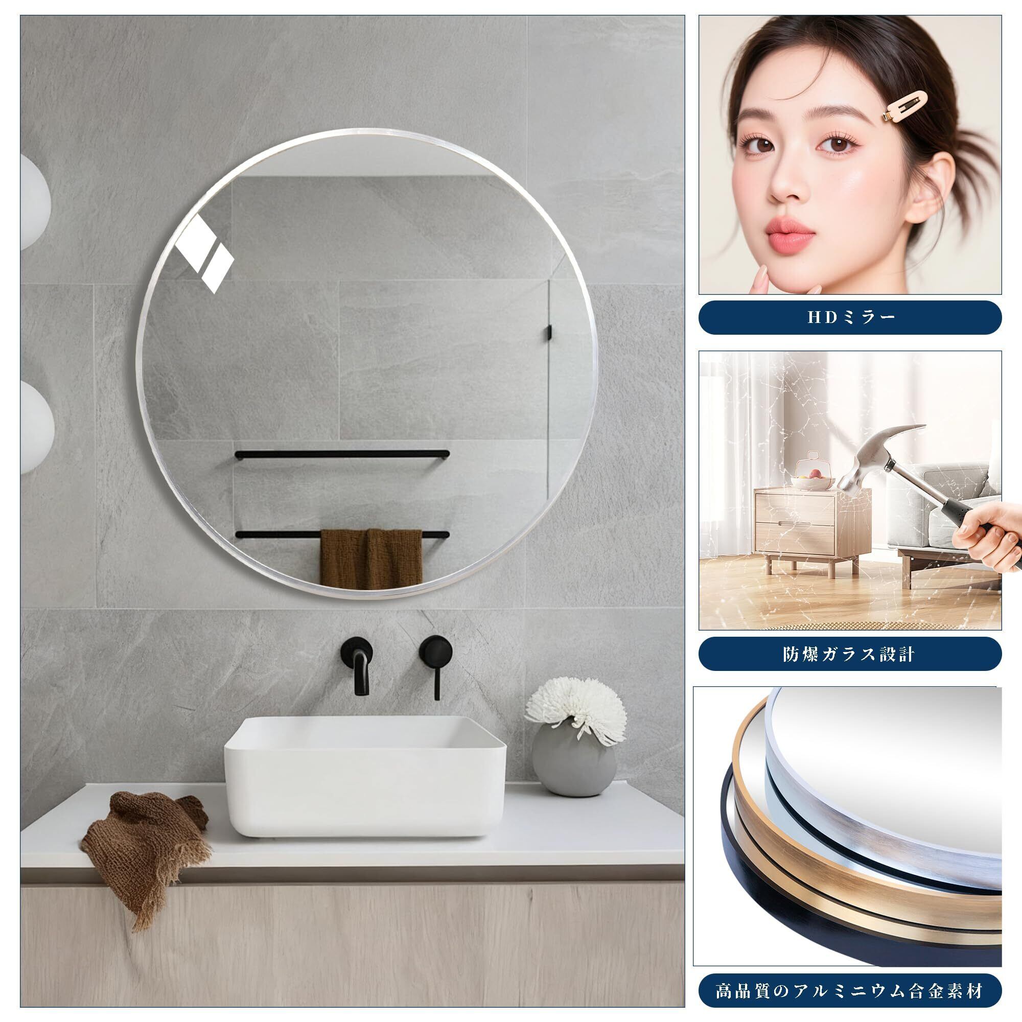 【商品仕様】丸型壁掛けミラーのサイズ:直径50cm。フレーム厚み3cm。フレーム材質:アルミフレーム。本体重量:3KG