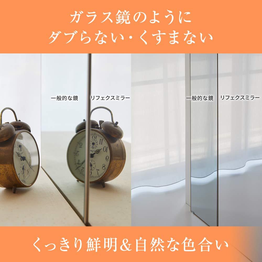 【ここがポイント! 3】「映像が鮮明でキレイ! ! 」厚みで映像がダブってしまうガラスの鏡に比べて、薄いフィルムなのでくっきりと鮮明に映ります。また緑がかっているガラスの鏡に比べ、フィルムの透明度が高いため、肌の色が自然に映ります。そのため、光学機器や映像システムにも利用されるほど、精度の高い鮮明な鏡です。ご家庭の『ファッションミラー』に最適です。
