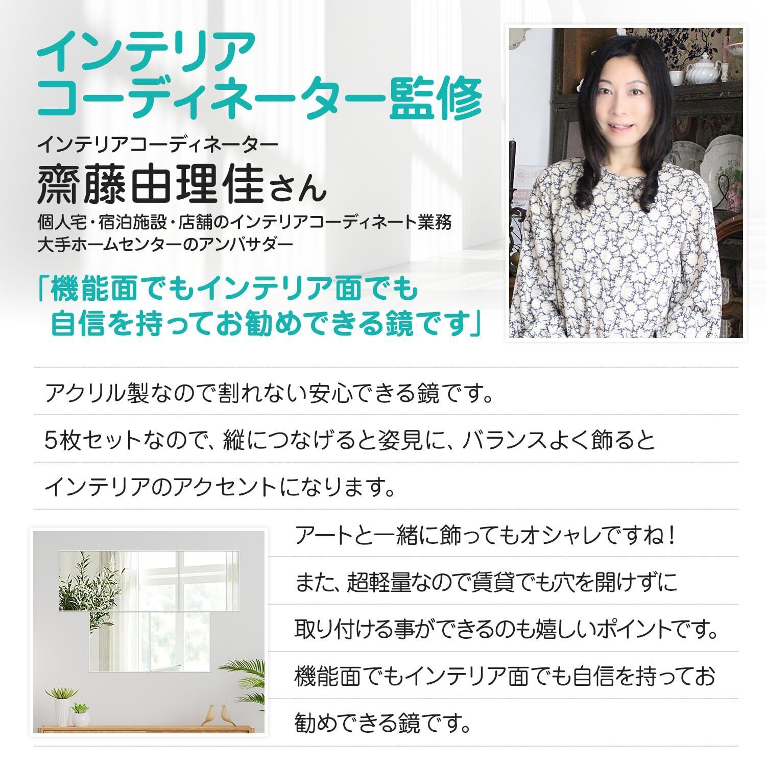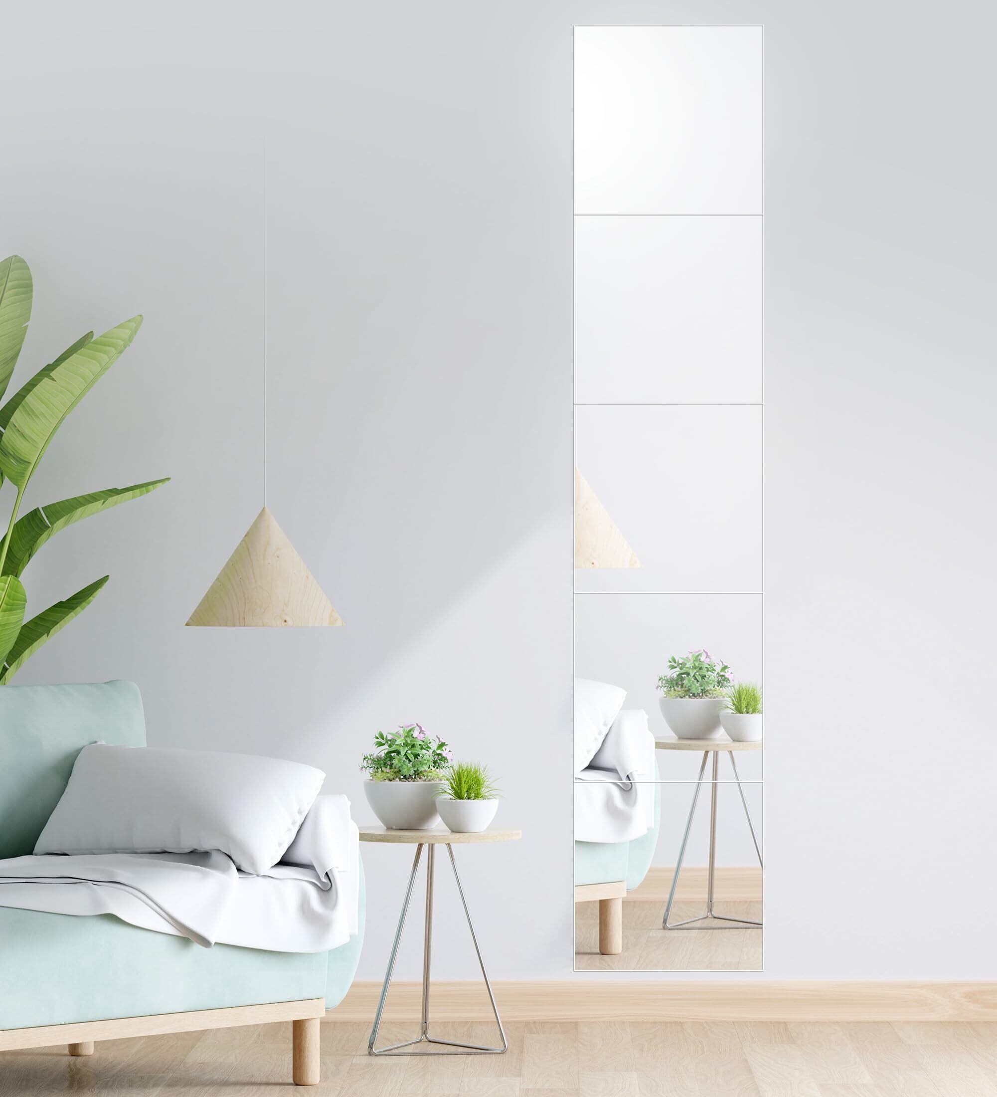 【連結させて姿見に】30cm×30cmの正方形の鏡をを5枚セットにしました。1枚だけ使用することでメイク直し用や数枚使用してヘアセット用に、また縦に連結して場所を取らない姿見として配置することもできます。さらに、空きスペースに配置してインテリアとしても活用できます。厚みは約2cmと薄型なので、スペースを取ることなく利用できるのも魅力です。