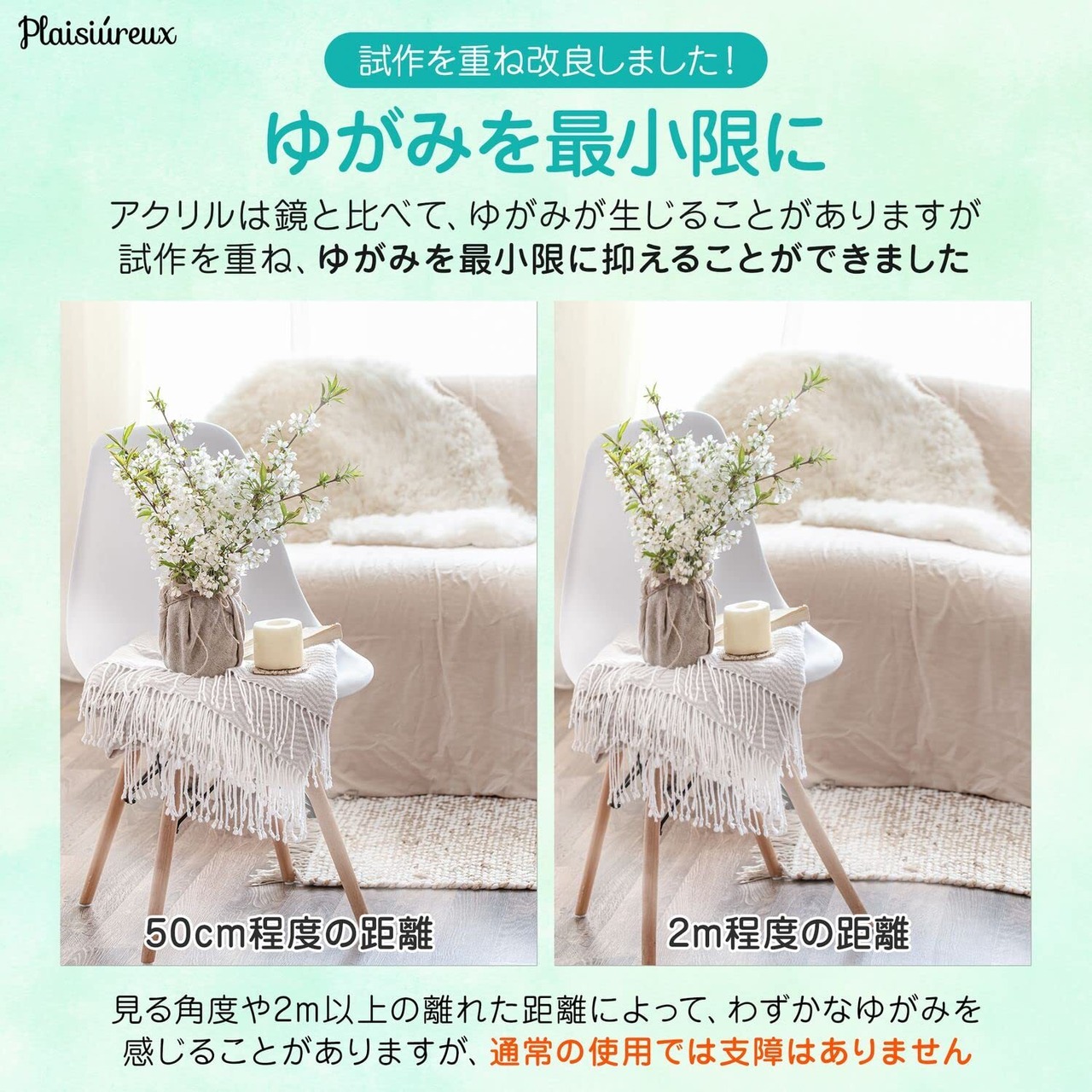 【ゆがみが少ない】アクリルは鏡と比べて素材の性質上、歪みが生じることがありますが、Plaisiureux割れない鏡セットではゆがみを軽減するために試作を重ねました。通常の使用においては支障のないレベルでゆがみを最小限に抑えることができました。ただし、鏡を見る角度や距離によってはわずかなゆがみを感じることがありますので、その点をご了承ください。