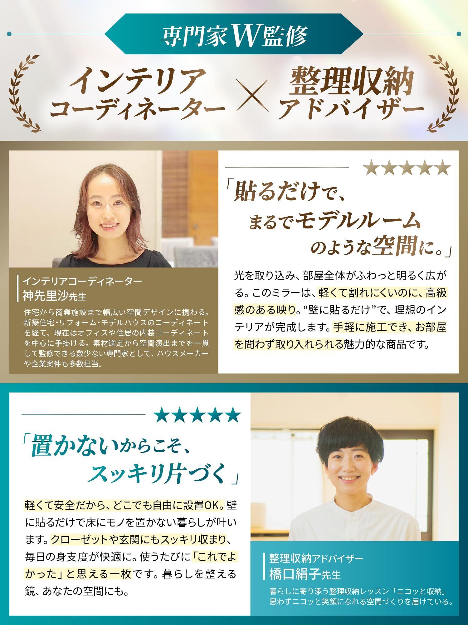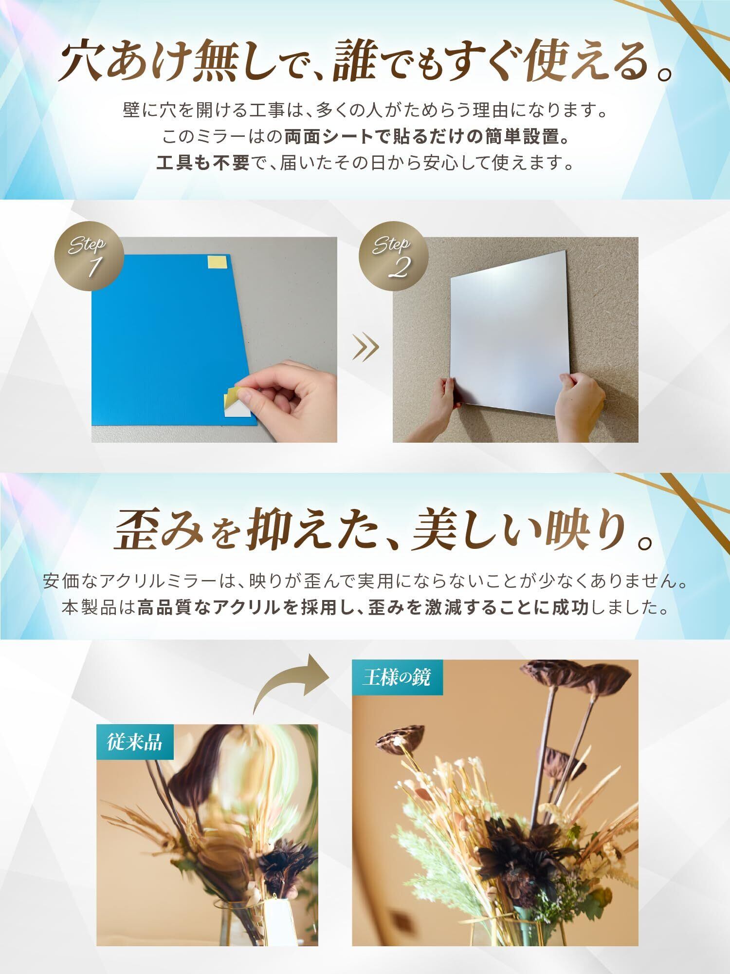 ※一般的な壁紙には対応しておりますが、凹凸が大きい壁紙やデリケートな壁紙には適しておりません。 凹凸が大きい壁紙には養生テープなどで凹凸をなるべく平らにし、両面テープの粘着面積を増やしてご使用ください。 ️万が一、商品が破損して到着した場合は、お気軽にご連絡ください。 到着時に破損していたミラーについては、返品なしで全額返金または無料交換いたします。