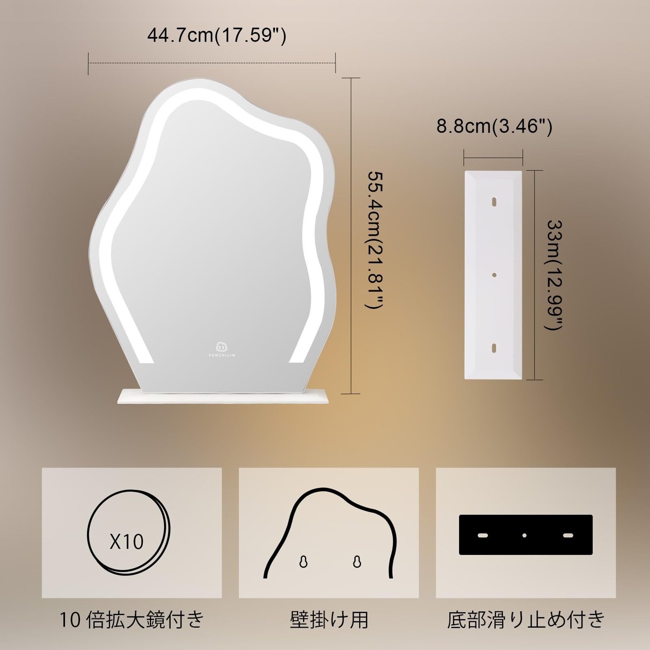 10倍拡大鏡:吸盤式10倍拡大鏡が付き、毛穴の状態やアイラインのズレもチェックでき、肌の細やかい状況とスキンケアをしっかり把握します。視力が低下して見えづらい方に、メガネがなくてもメイクできます、メイクも便利です。