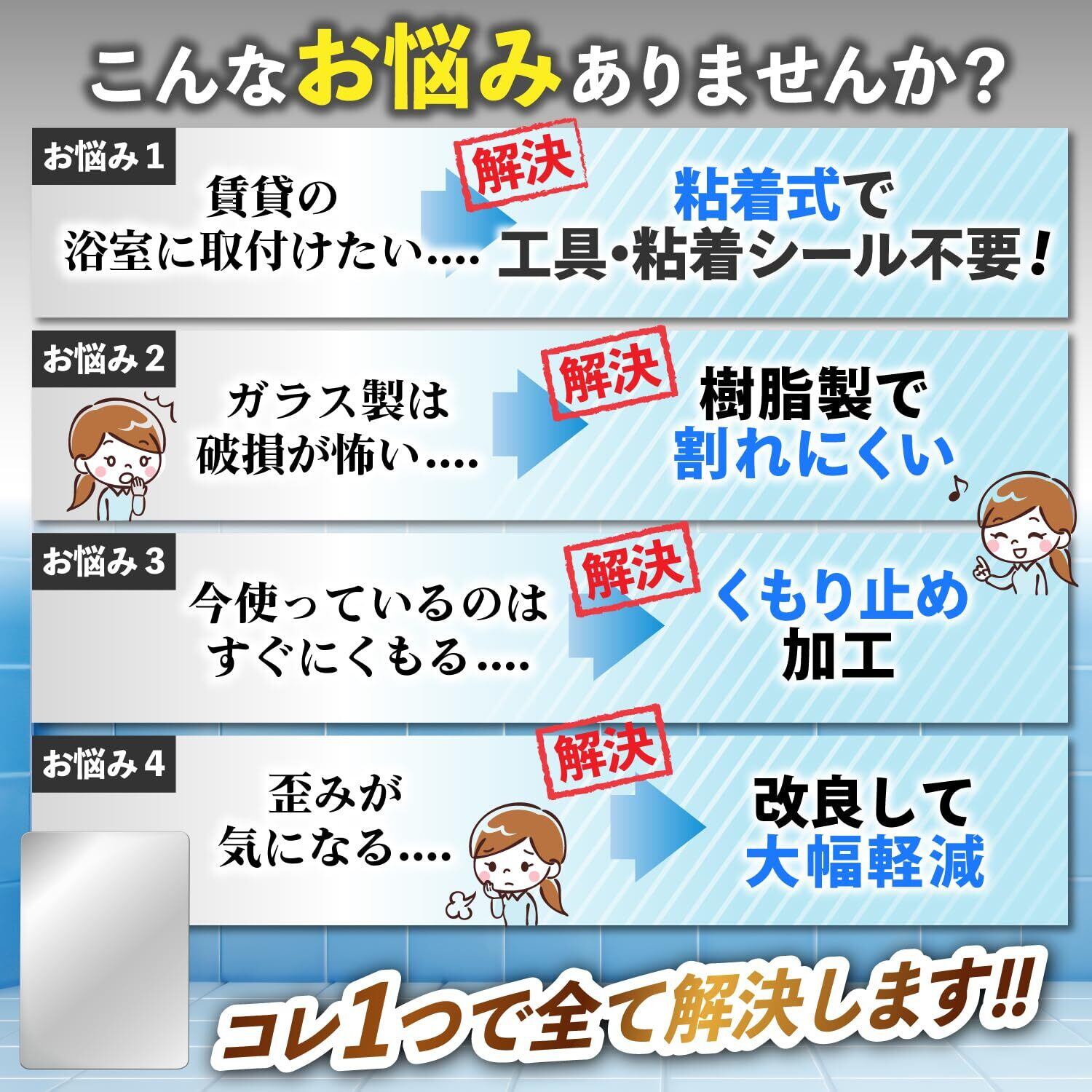 【商品基本仕様】ココミラーCocoMirror購入のお客様の要望におこたえして、浴室専用の割れない鏡、CocoMirror Bath を開発いたしました。1.曇り止め加工、 2.粘着シール式、3.こだわりの映像、4.割れない、5.ハードコート加工(汚れ・傷防止)の特徴があります。※曇り止め加工をしていますが全くもらないわけではありません。曇った際は水をかけてください。