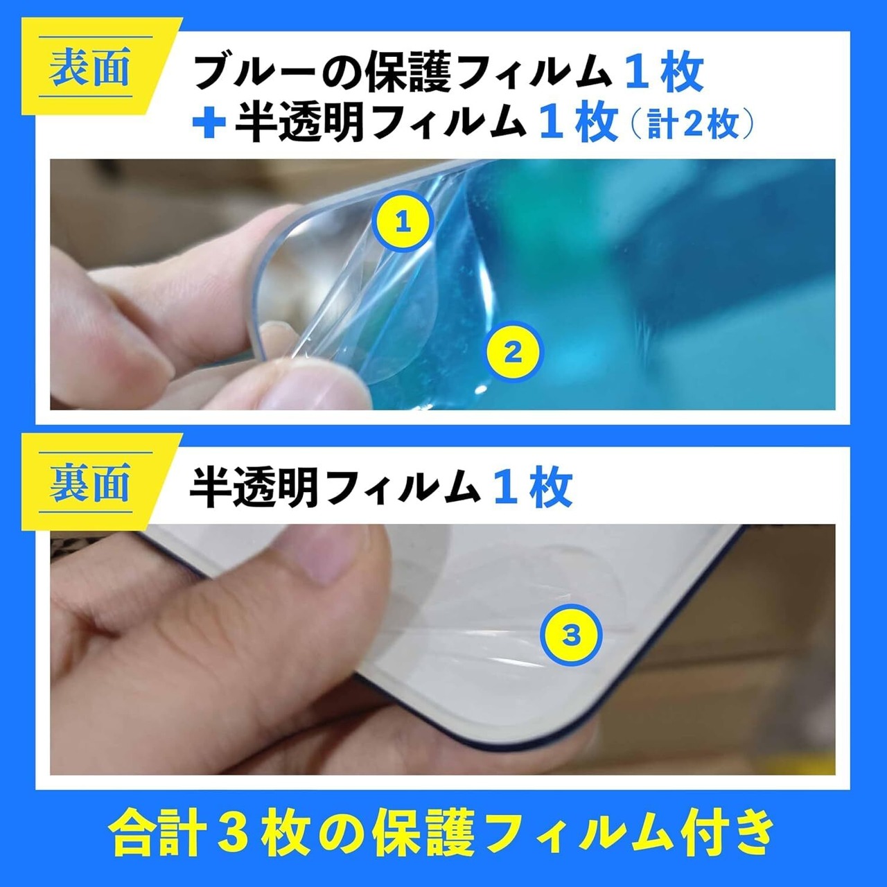 ️本製品には、表面に「ブルーのフィルム」と「半透明フィルム」の2枚、裏面に「半透明フィルム」1枚、合計3枚の保護フィルムが貼付されています。 ご使用の際は、必ず両面のすべての保護フィルムを剥がしてからご使用ください。 これまでに「鏡に傷がある」とのお問い合わせをいただいたケースがございましたが、いずれも保護フィルムが剥がされていない状態でした。 保護フィルムは一見わかりづらい場合がありますので、お取り扱いには十分ご注意ください。