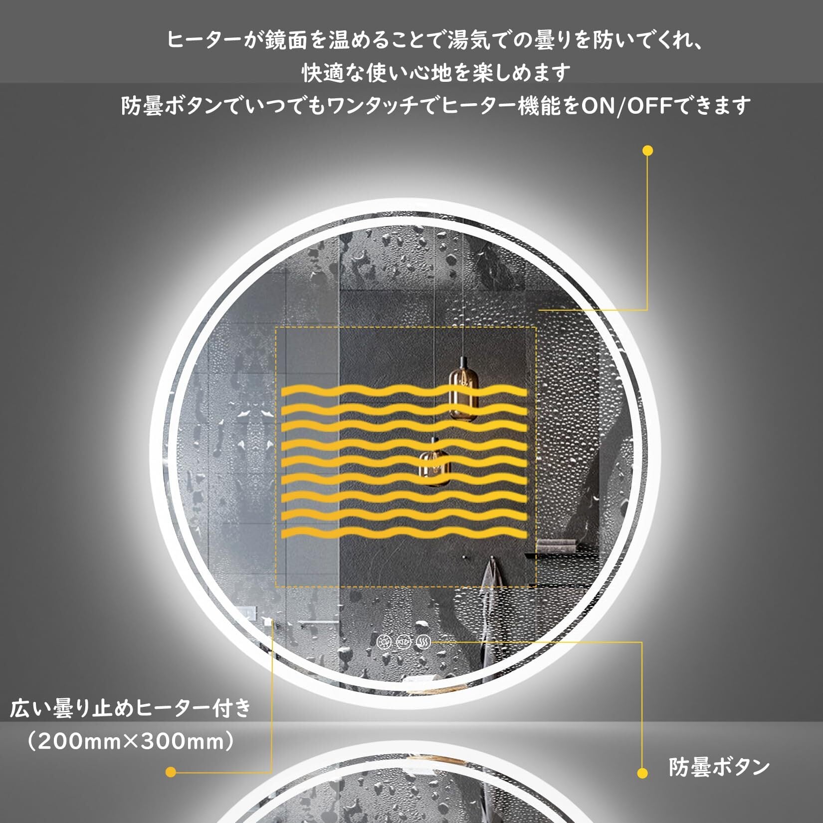 【冬場でも便利に使える防曇鏡】ヒーター付きのウォールミラーで、鏡面にある防曇ボタンを押すだけで、鏡を温めることで蒸気による鏡の曇りを防いだり解消したりできます。冬に使用するのにとても便利です
