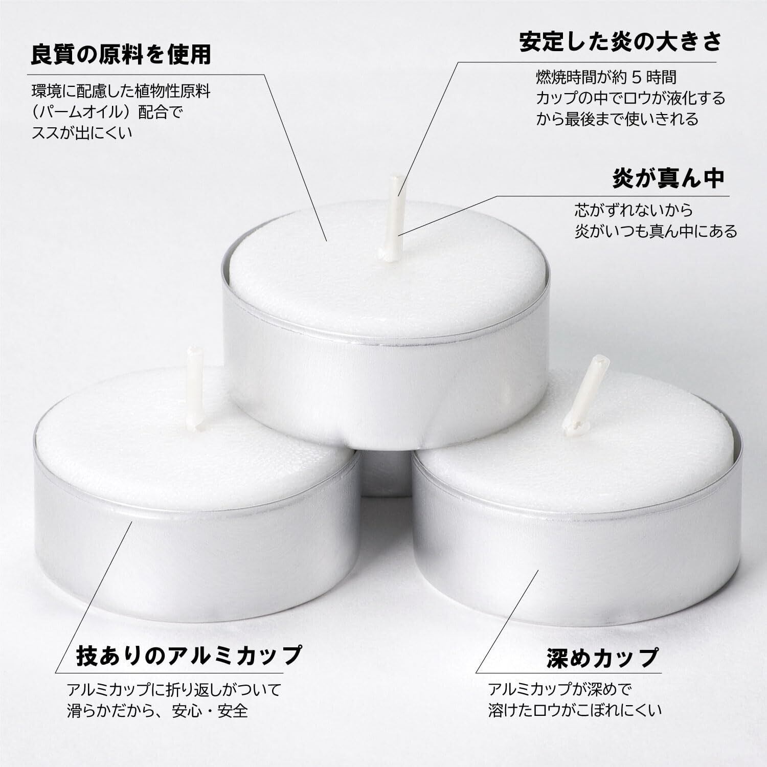 アルミカップにはいったカップ入りローソクです。炎の大きさが安定しており、すすが少ない作りになっています。燃焼時間約5時間です。 原材料・成分 パラフィンワックス、パーム油、綿糸 安全警告 高温多湿を避け、直射日光を避けて保管してください。乳幼児の手の届かないところで保管してください。