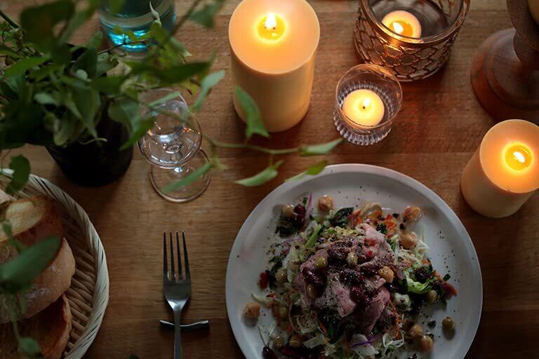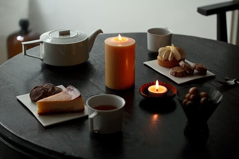 長い燃焼時間と匂いやススがほとんどないという特長があり、 お部屋を汚しにくく、また食卓の灯りとしても楽しむことができます。