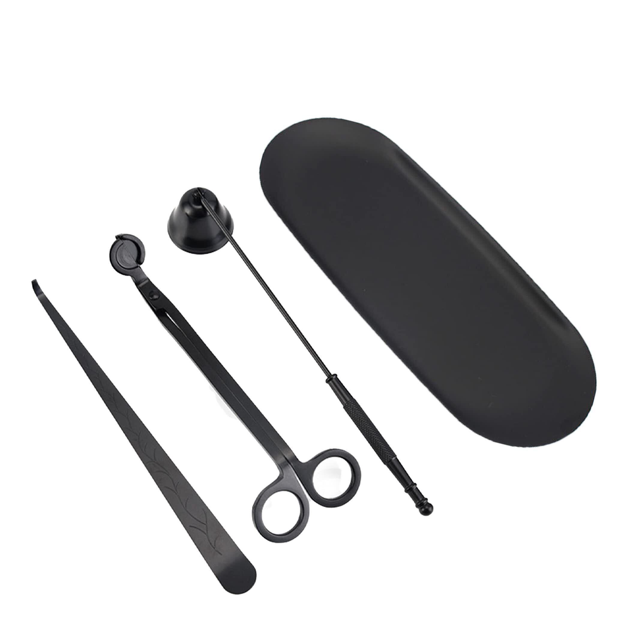 キャンドルの炎を上手に楽しむための4点セット:カップ部分でキャンドルの炎を瞬時に消せるキャンドルスナッファー、焦げた芯をカットするためのハサミ、斜めになった芯を起こしたり芯をロウに浸けたりするためのウィックディッパー、ツールを置くためのトレイの4点がセットになっています。これがあれば、キャンドルを上手に楽しむことができます。