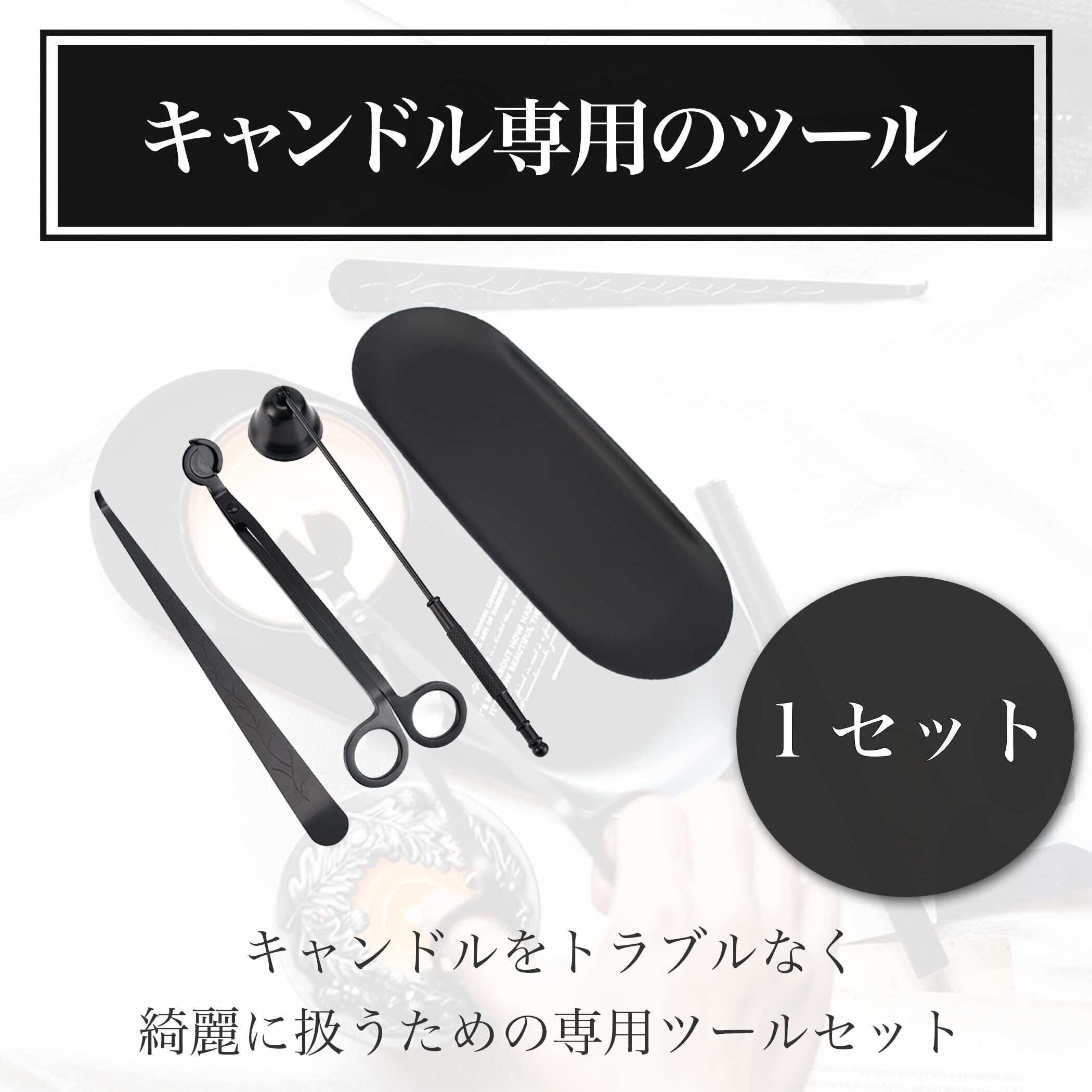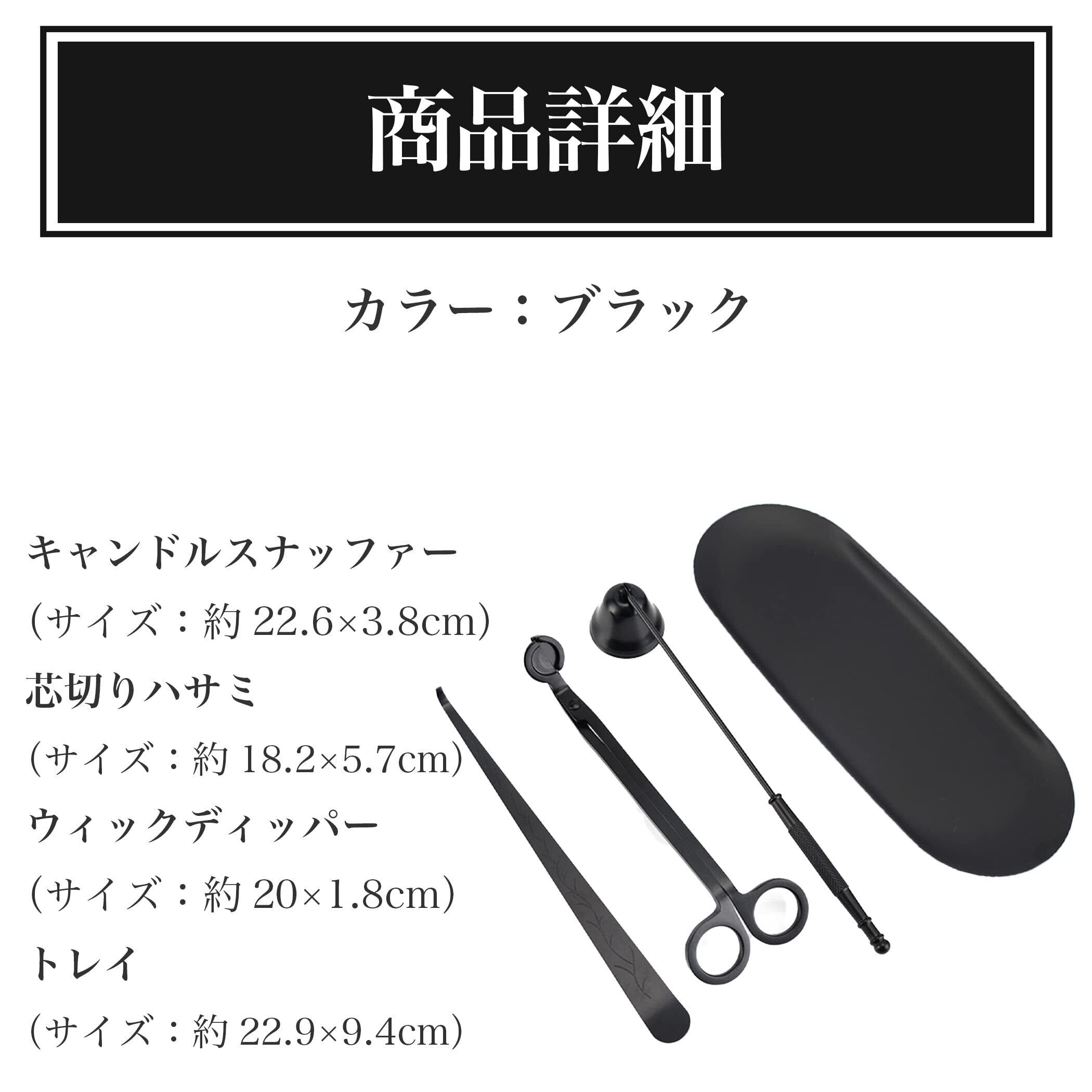 セット内容:キャンドルスナッファー(サイズ:約22.6×3.8cm)、芯切りハサミ(サイズ:約18.2×5.7cm)、ウィックディッパー(サイズ:約20×1.8cm)、トレイ(サイズ:約22.9×9.4cm) カラー:ブラック ※モニターの環境等により、色の見え方に若干差が生じる場合がございます。