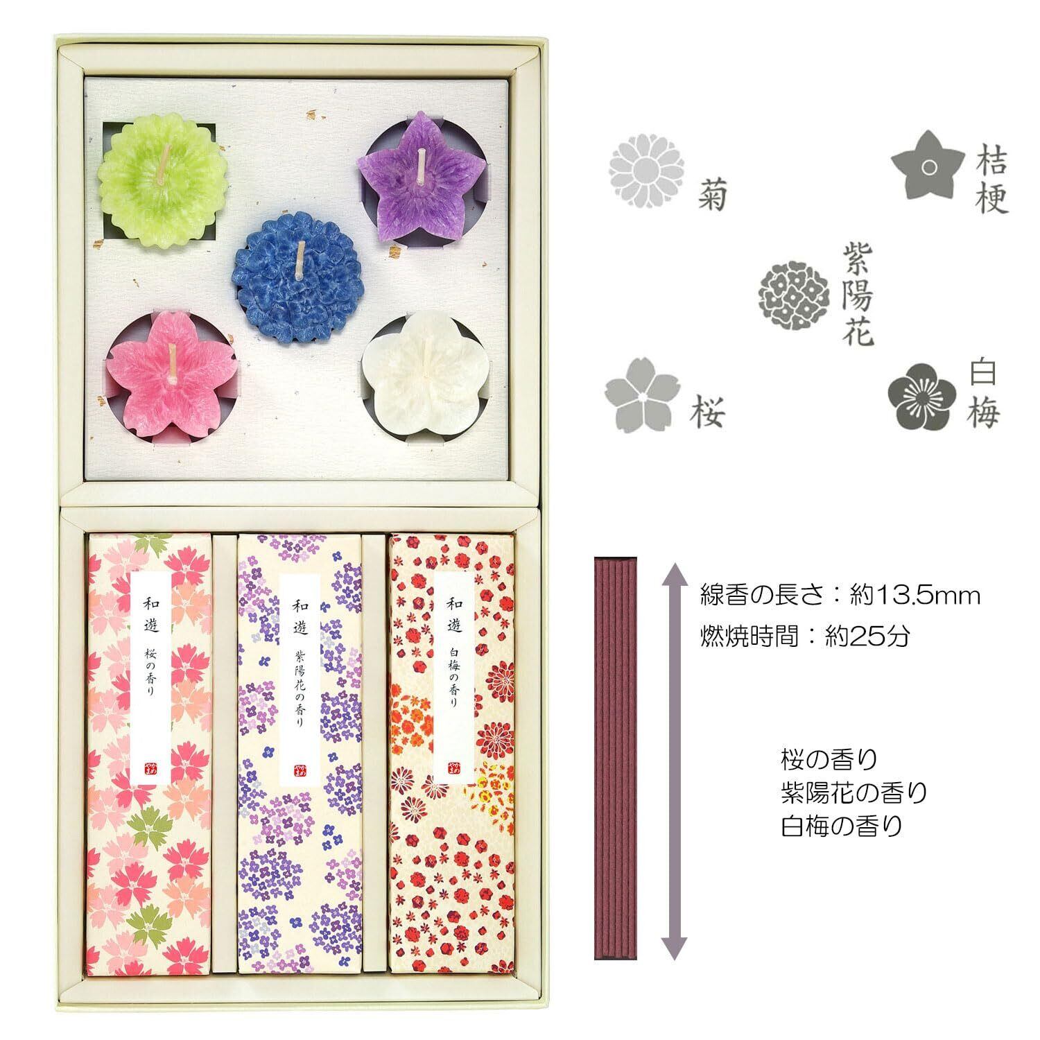 ●和遊のお線香と花づくしキャンドル、2つの大人気のご進物がセットになりました。●お線香は季節を感じる桜と紫陽花、白梅の3つの香り。●ローソクはススが出にくい植物性原料配合で、それぞれの花の香り付き。●水を入れた器に浮かべるとフローティングキャンドルとしてもお楽しみいただけます。●セット内容…花づくしキャンドル(菊・桔梗・紫陽花・桜・白梅)×各1個、和遊線香(桜・紫陽花・白梅)×各1函