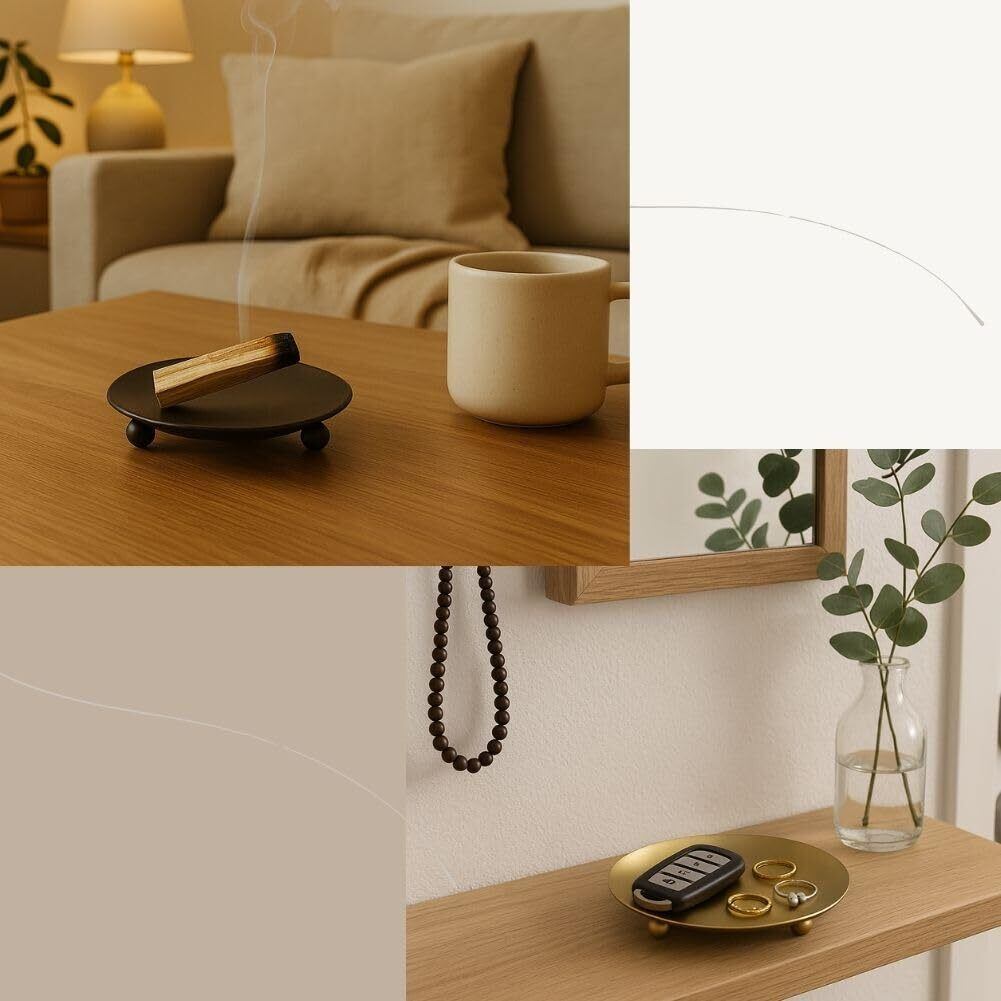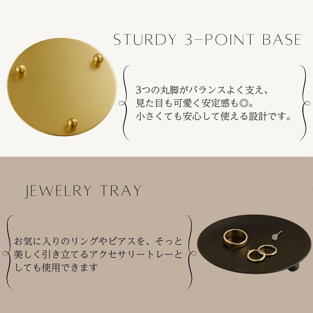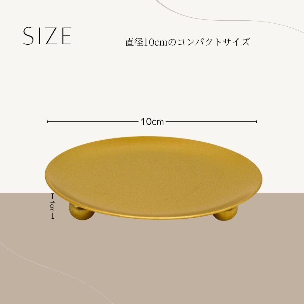 香木やキャンドルなどを置くのに適した直径約10cmの丸型トレーです。丸い脚が付いており、底面が接地しすぎない設計になっています。香皿としての使用のほか、ちょっとした小物置きとしてもご利用いただけます。