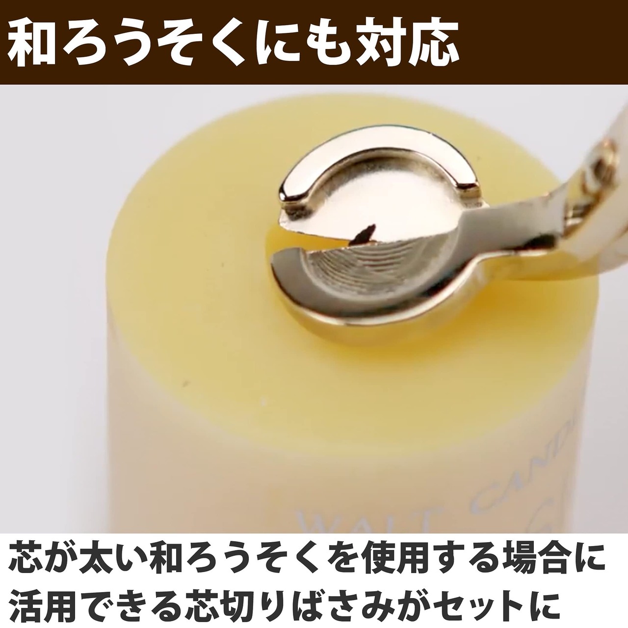 和ろうそくにも対応できるツールもセットに:芯切りばさみもセットになっておりますので、芯が太い和ろうそくを使用する場合にも対応できます。炭化して残ってしまった芯を取り除いて、炎の大きさを簡単に調節することが可能です。