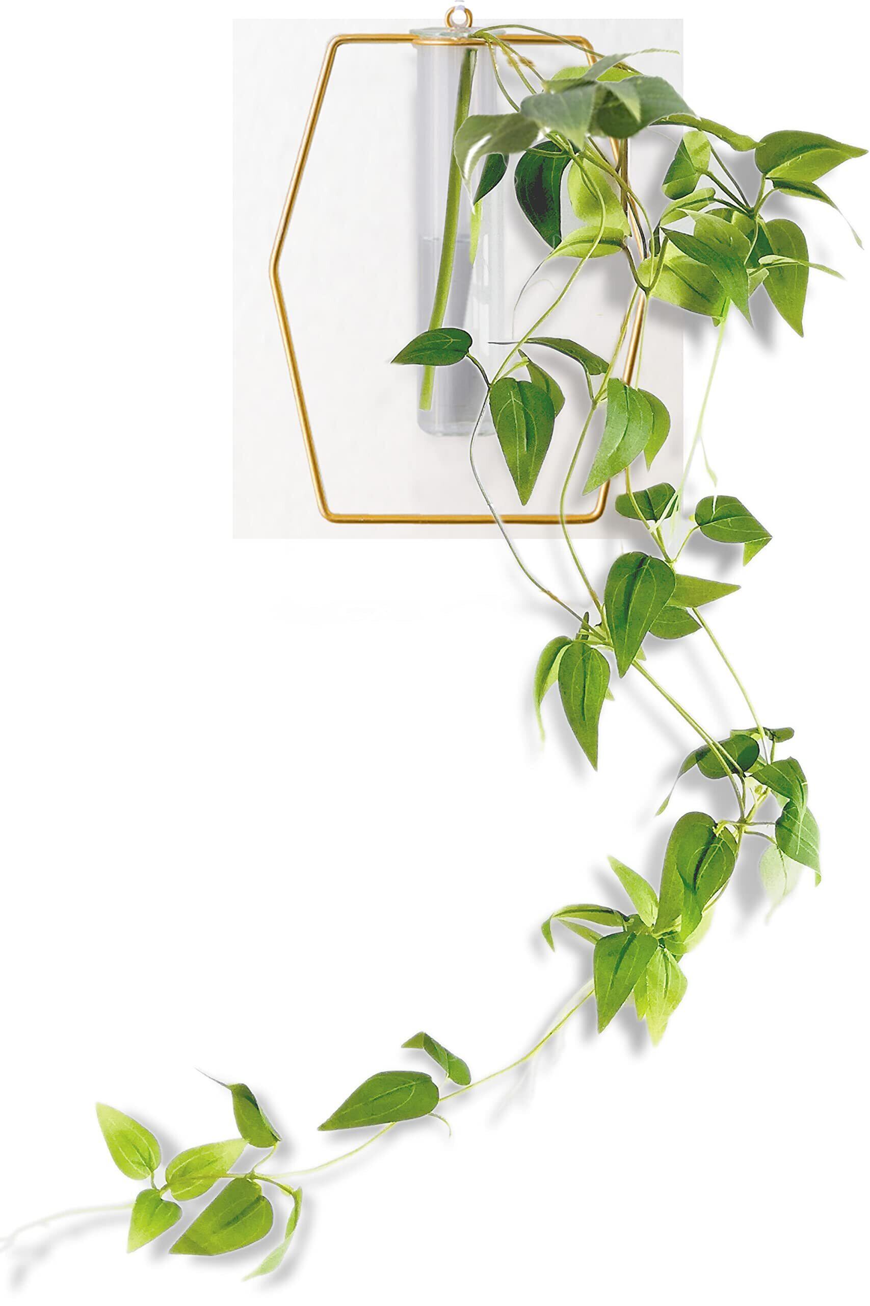 植物つきタイプ:フェイクグリーン 壁掛け花瓶 のセットです。ガラス管花瓶とゴールドのフレーム、釣り下げシルエットの素敵なフェイクグリーン 壁におしゃれなグリーンインテリアを。設置するだけでお部屋の雰囲気を良くしてくれる、有能な ウォールグリーン です。
