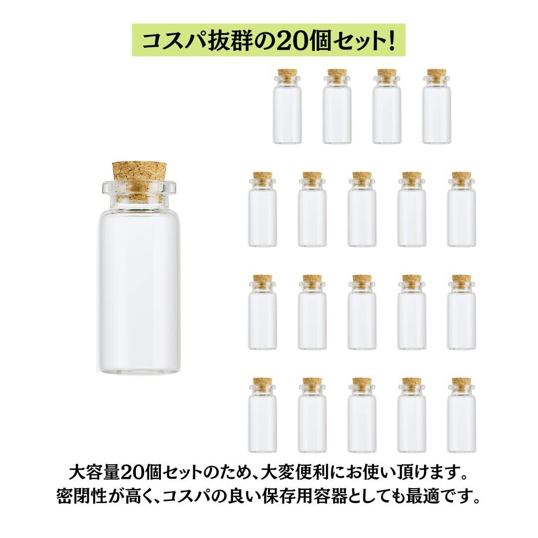 【コスパ抜群!20個セット】お得な大容量20個セットとなっておりますので、様々な用途で大変便利にお使い頂けます。全てのガラス瓶に密閉性の高いコルク製キャップが付属しておりますので、コスパの良い保存用容器としてもご利用頂けます。