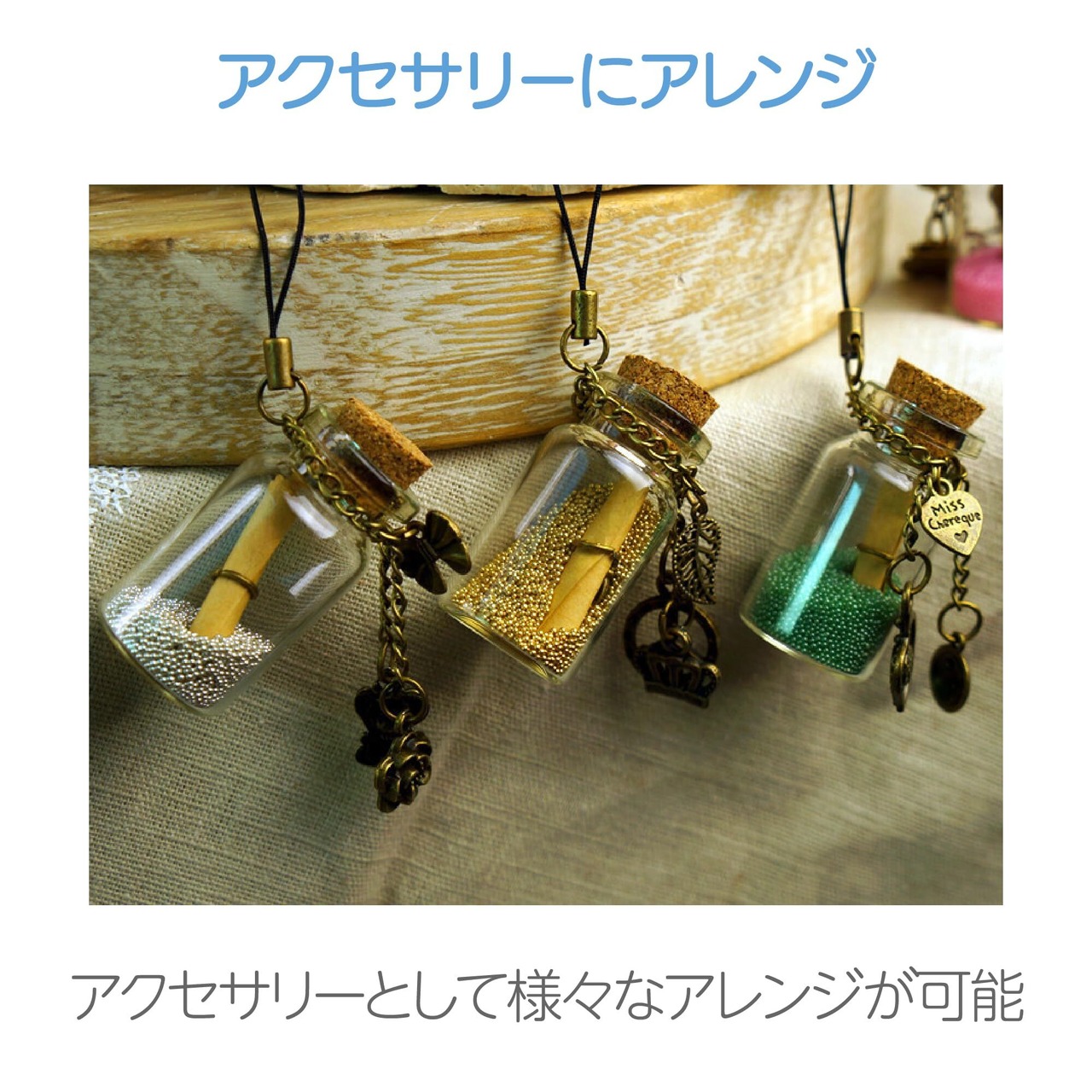 【アクセサリーにアレンジ】 コルクにヒートン金具、瓶のくびれ部分に革紐などを取り付ければ、アクセサリーパーツやチェーンをつけることができます。ピアスやペンダント、ストラップなど様々なアレンジが可能に。プレゼントにもおすすめです!
