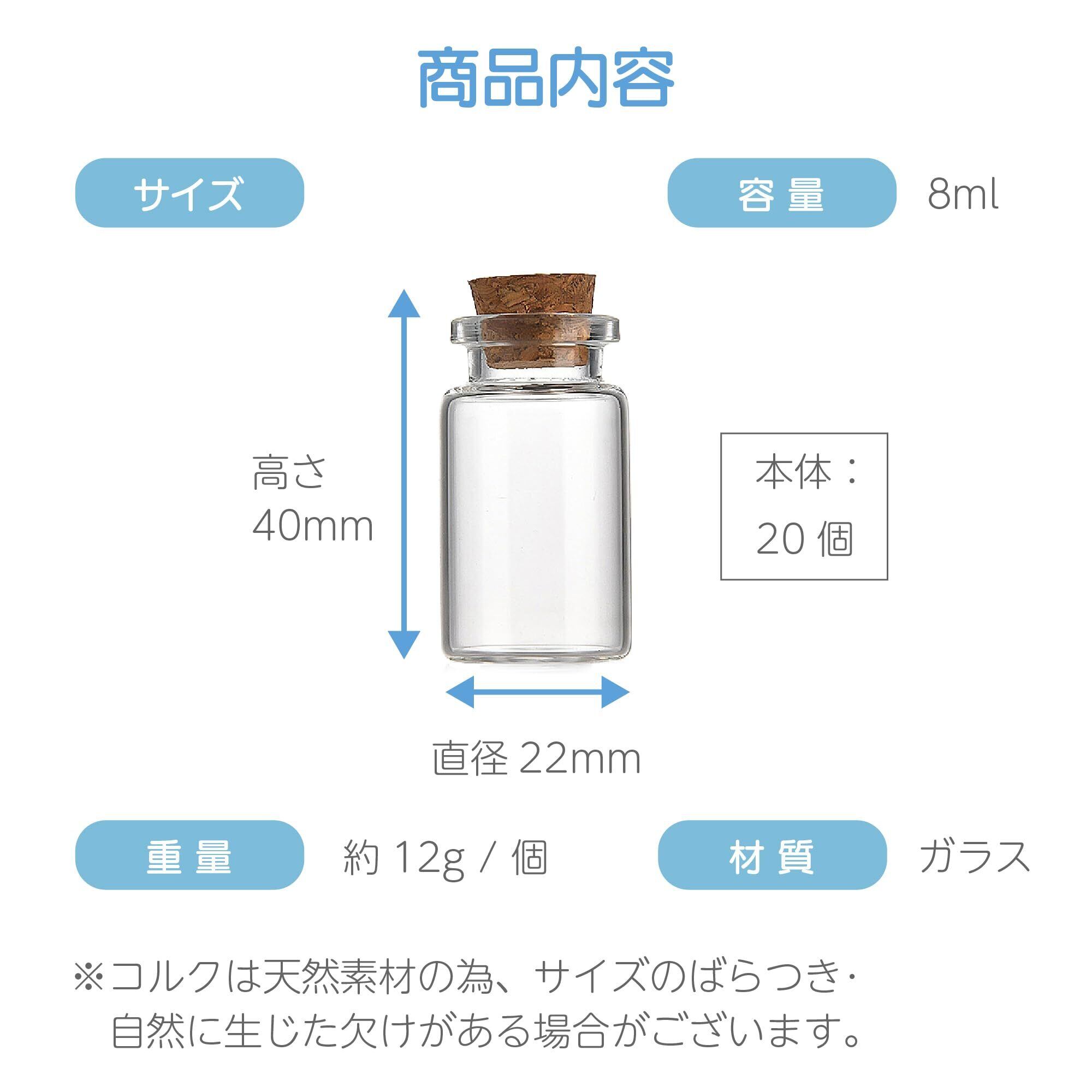 【商品内容】本体:20個 容量:8ml サイズ:直径22mm、高さ40mm 重量:約12g / 個 材質:ガラス ※コルクは天然素材の為、サイズのばらつき・自然に生じた欠けがある場合がございます。